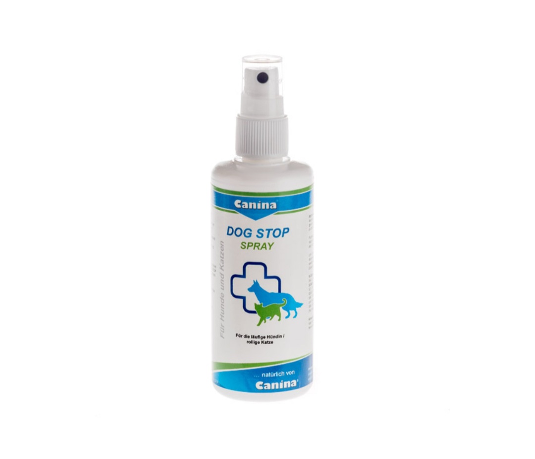 Canina Dog - Stop sprej je sprej na háravé feny, který ji ochrání před obtěžováním psy. Vedle venčení nalezne uplatnění např. také na výstavách. Sprej obsahuje eukalyptový a parafínový olej a pomocné látky.