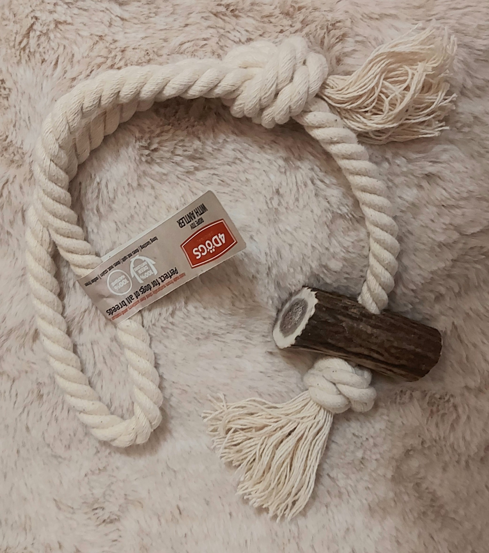 Jelení paroží pro psy 2v1 zdravý pamlsek s minerály (vápník, fosfor, hořčík a draslík), kolagenem a přetahovadlo z bavlněného lana pro psy malých a středních plemen pro snížení stresu a zklidnění psa