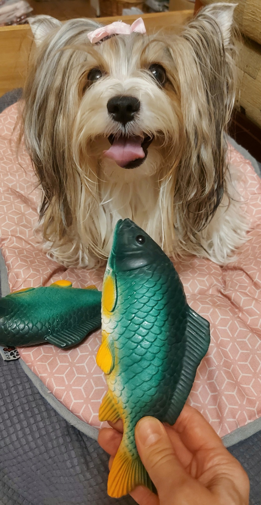 Hračka ve tvaru kapříka si získá každého pejska, který má rád pískací zábavu