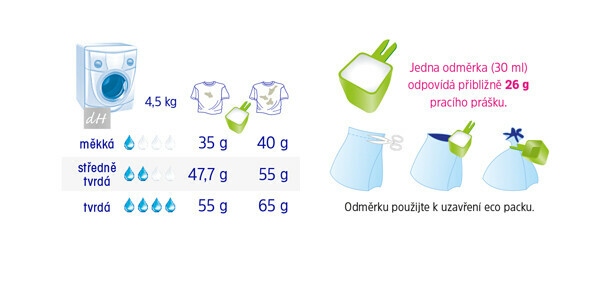 Prostředek je vhodný pro všechny teploty pracího cyklu (30 °C, 40 °C, 60 °C, 90 °C). Použitím nízkoteplotních programů, doporučené dávky a maximální možné náplně pračky snížíte spotřebu energie, vody a minimalizujete tak dopad na životní prostředí.