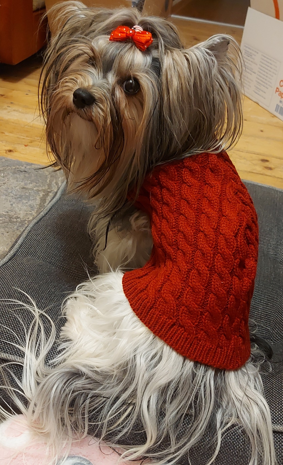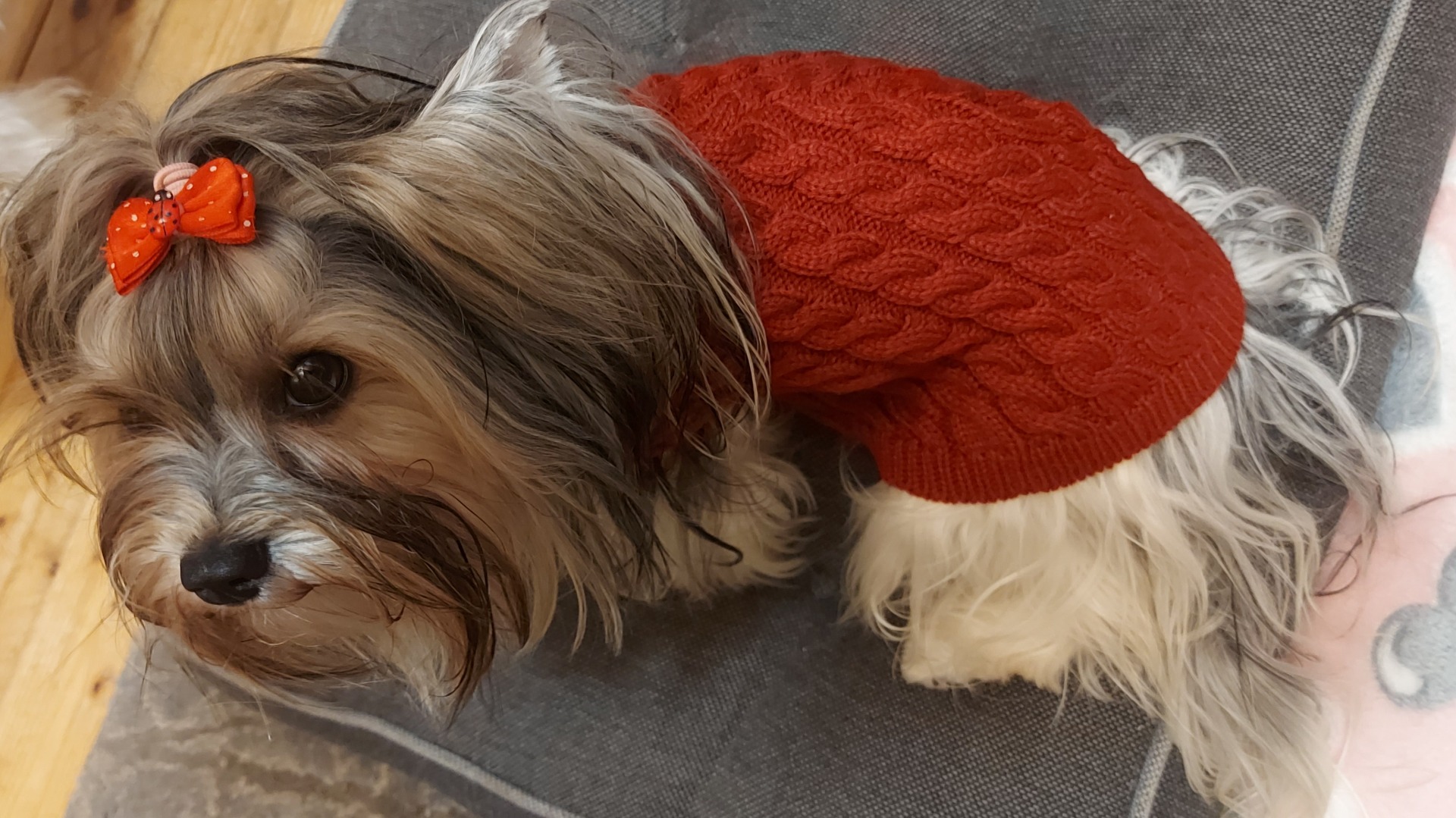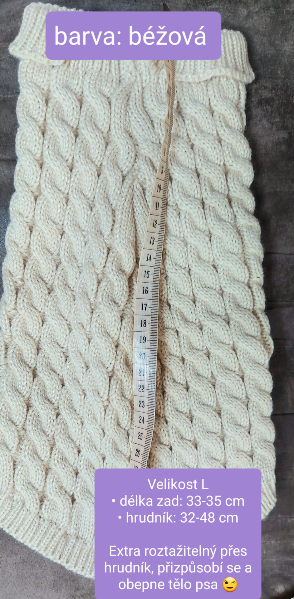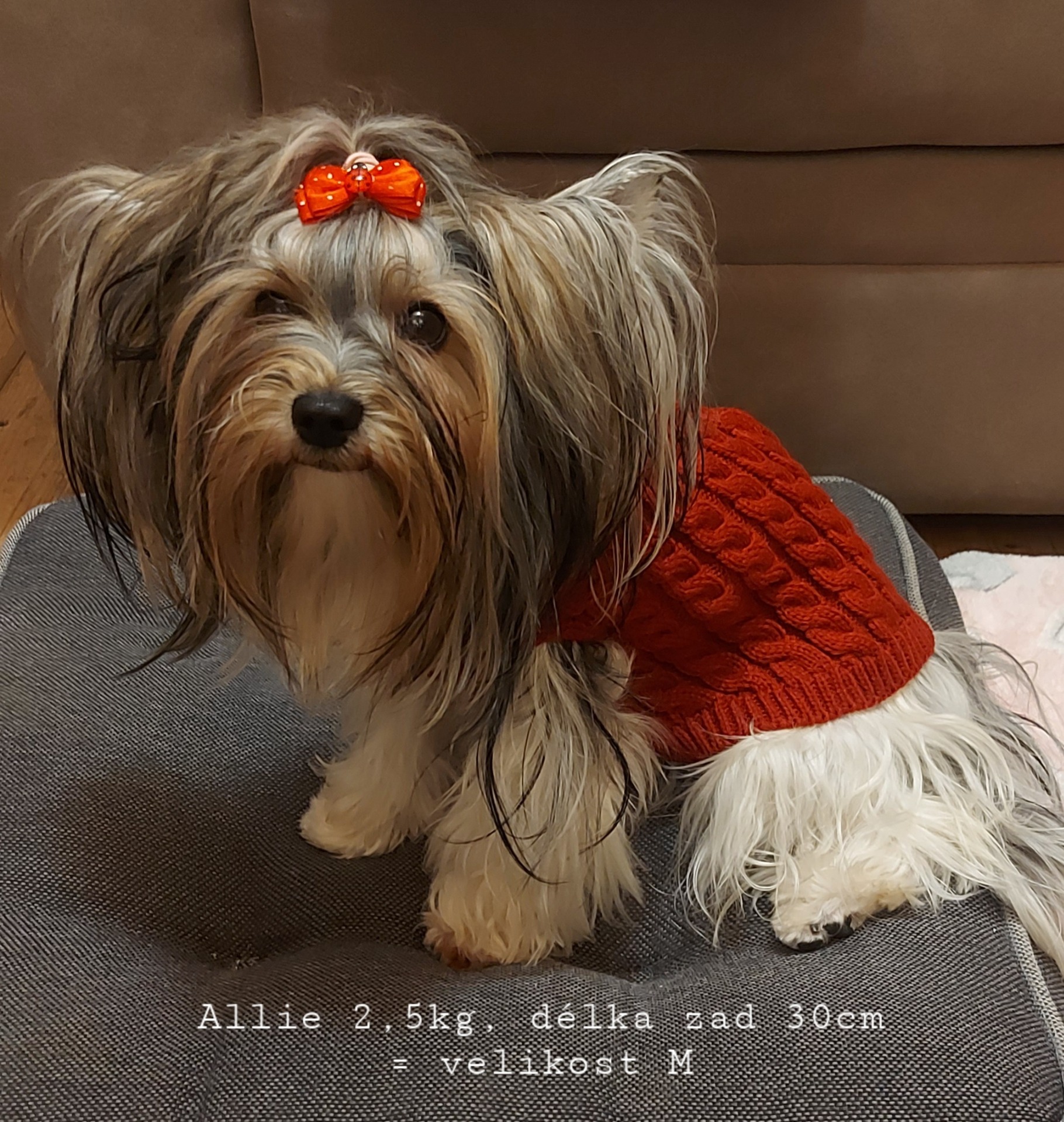 Velikost svetru zvolte o 1 cm delší (záda), aby svetr pohodlně kryl celé tělo psa až po ocásek. Při praní se může svetr o 1 cm zmenšit na délku, dodržujte praní na šetrný program 30 st. s jemným pracím gelem