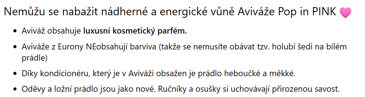 Eurona má jemné, hypoalergenní vůně, aviváže jsou přírodního složení bez plnidel, fosfátů a škrobu, můžete bez obav vyprané prádlo vložit to sušičky, která ještě zvýrazní vůni!