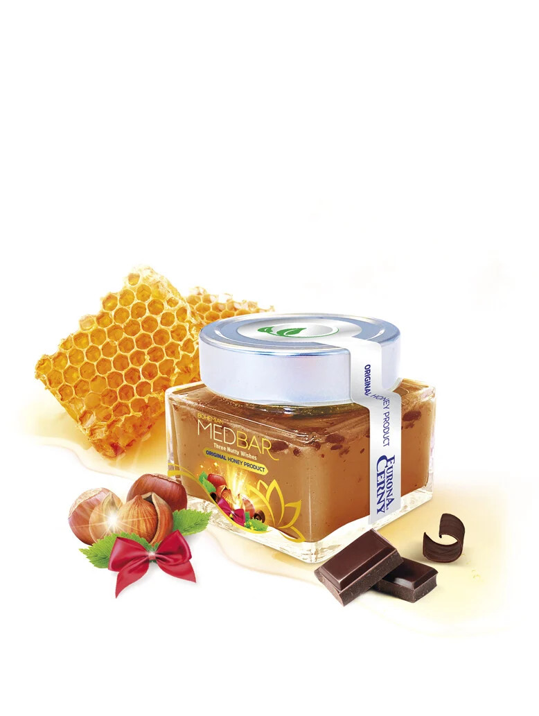 Lahodná delikatesa z pastovaného květového medu s pravým kakaem, čokoládou, sekanými lískovými ořechy a jejich praženou zemitou vůní protkanou jemností gurmánského medového "krému" BOHEMIAN MEDBAR Three Nutty Wishes, který přináší kouzlo tří oříškových přání...