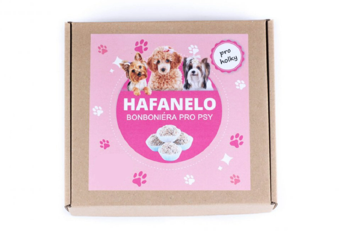 Dárkové balení koulí Hafanelo, stylizované do růžova pro psí holky, je vhodnou pozorností při návštěvách jiných chovatelů nebo i pro psa samotného v době jeho narozenin, svátku, vánoc atd.