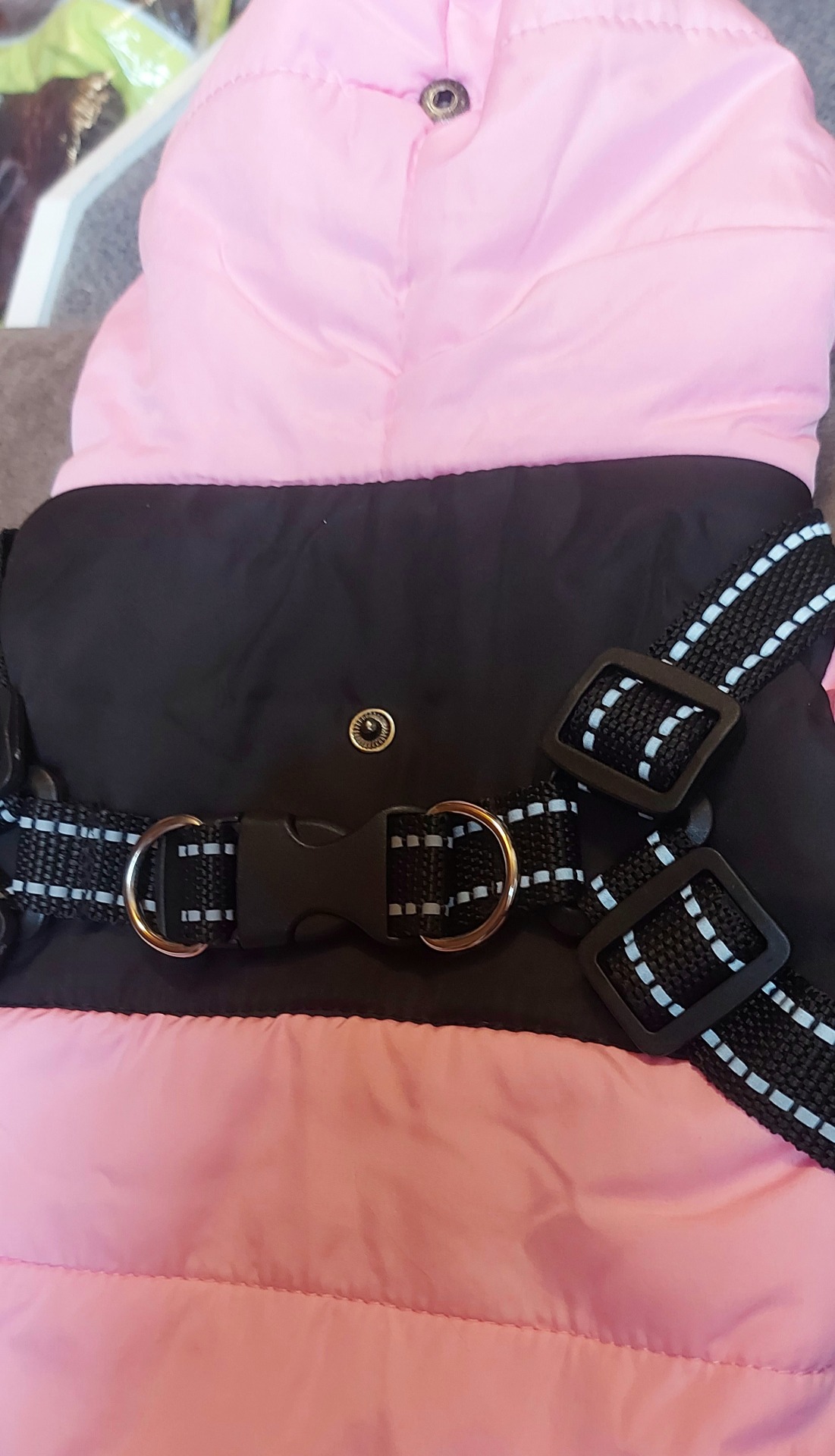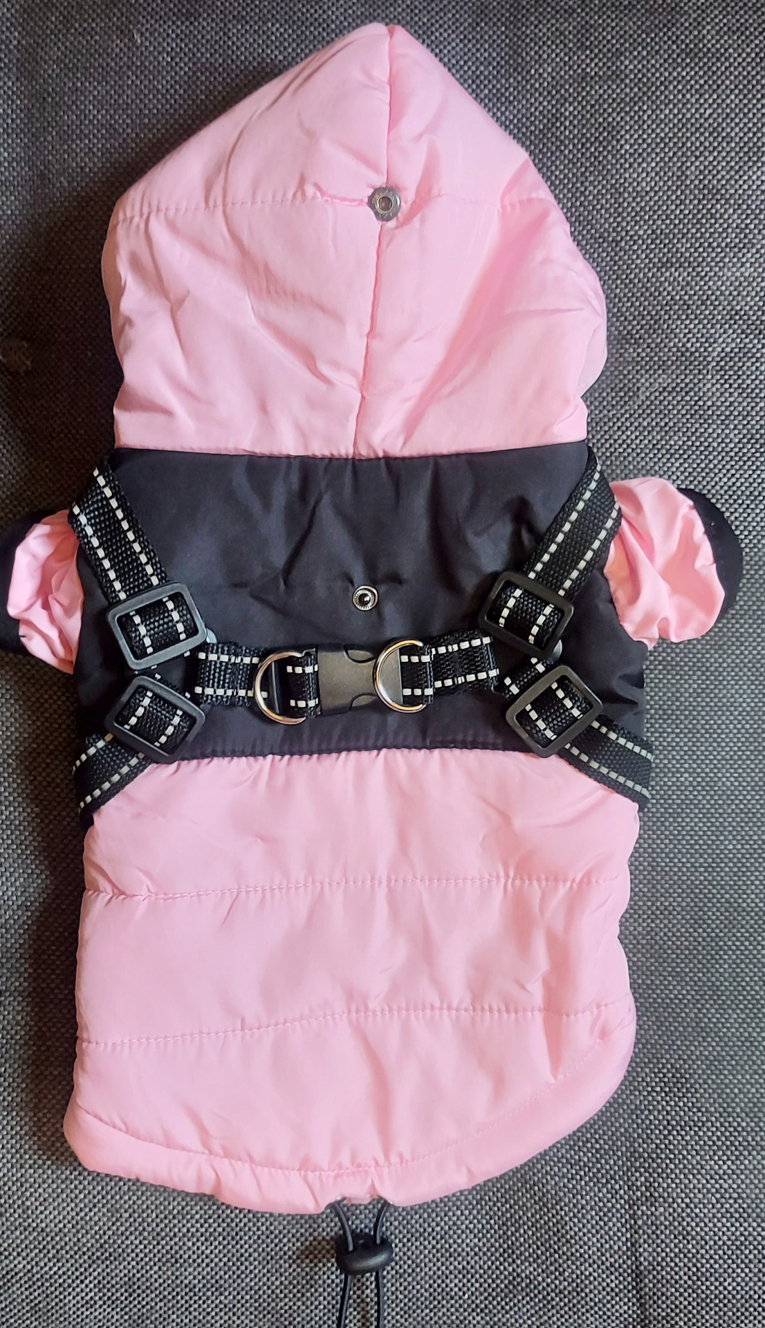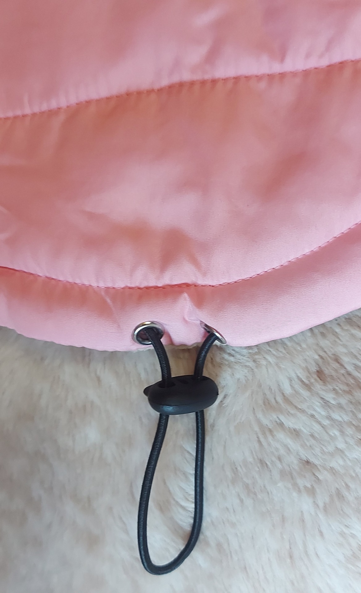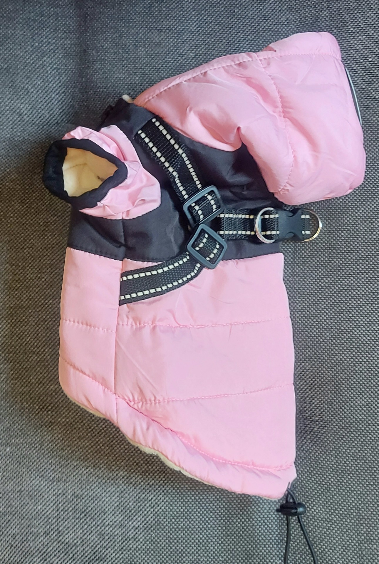 Na kapuci je nášivka, bundu lze stáhnout přes hrudník upínacím mechanismem na postroji, hezky drží na těle pejska a chrání ledviny před prochladnutím