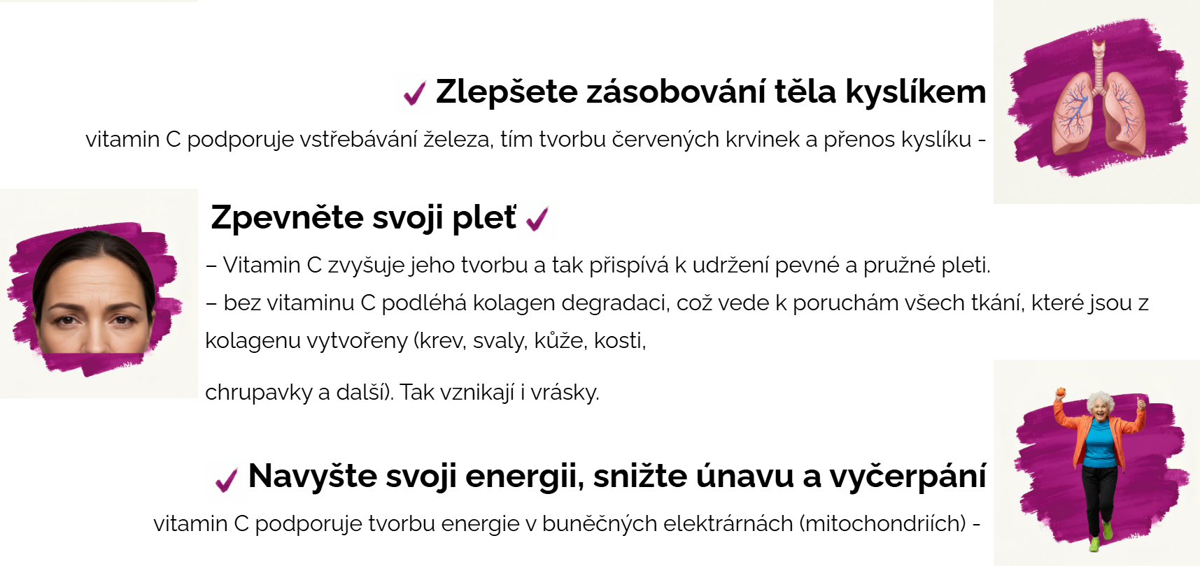 – Vitamin C zvyšuje jeho tvorbu a tak přispívá k udržení pevné a pružné pleti.