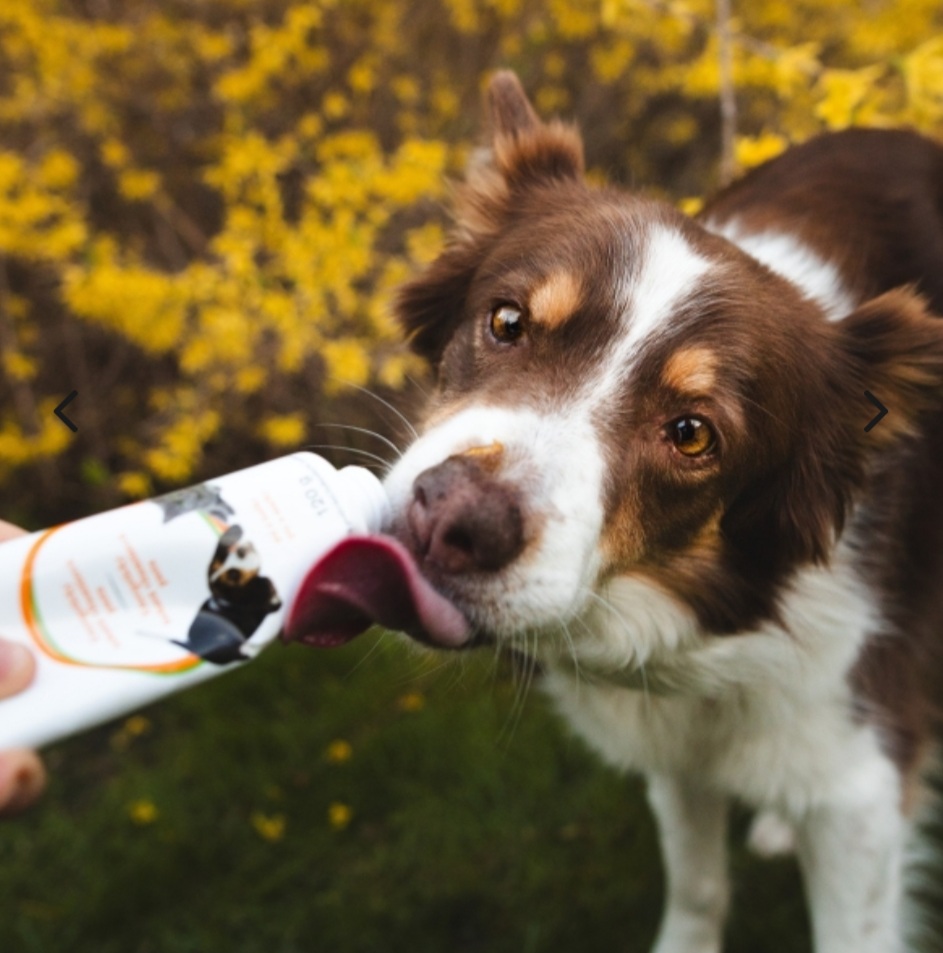 Dávkuji velikost hrášku na prst a dám feně slízat z prstu. Okamžitě je vidět výsledek, fenka je živější, má před porodem víc energie a nálady