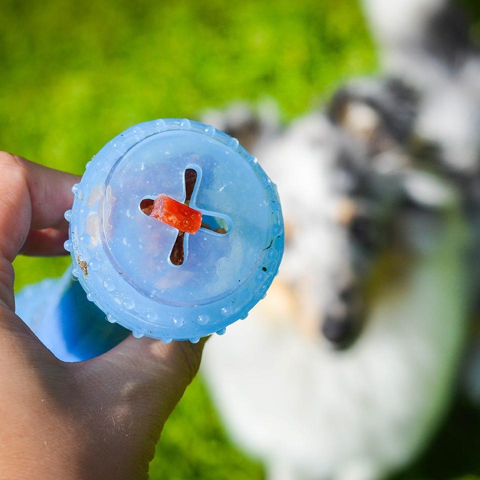 Můžete hračku potřít i paštikou, tvarohem apod. Pejsek bude hračku olizovat a zvýší se u něj produkce serotoninu - hormonu štěstí. Zároveň nebude paštiku tak hltat