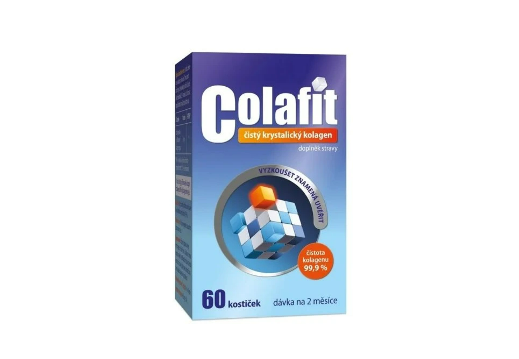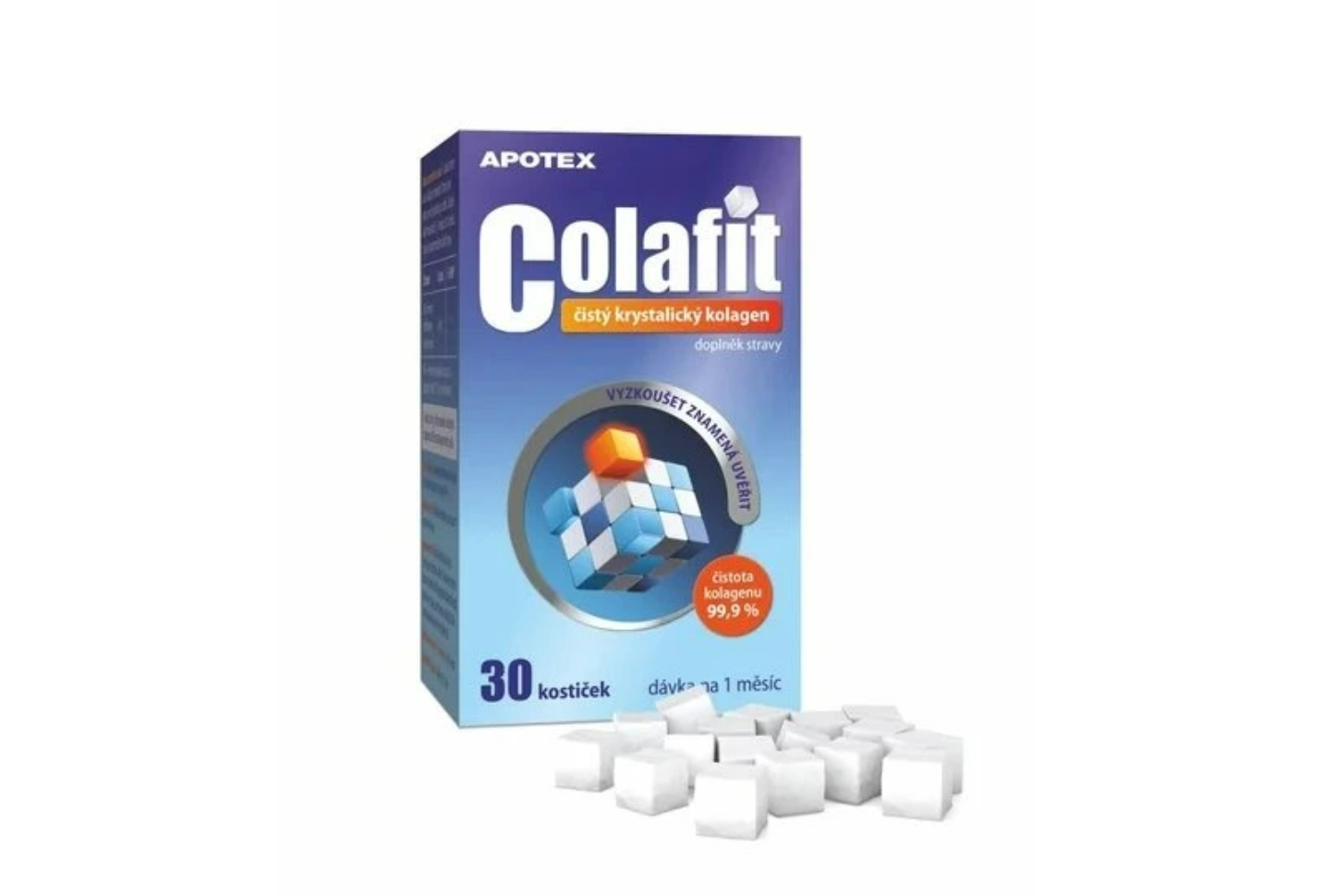 COLAFIT je oblíbená, zkušenostmi uživatelů prověřená forma lyofilizovaného kolagenu v malých bílých měkkých kostičkách, které obsahují pouze kolagen čistoty 99,9% (bez pomocných látek, barviv,…) a snadno se užívají. Díky netradiční a zároveň šetrné metodě zpracování je z kolagenu odstraněna voda, proto mohou být kostičky malé, měkké a lehké. 1 kostička (8mg) lyofilizovaného kolagenu odpovídá 800mg kolagenového gelu