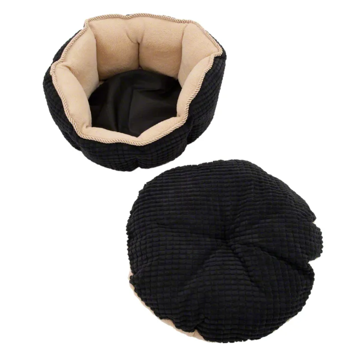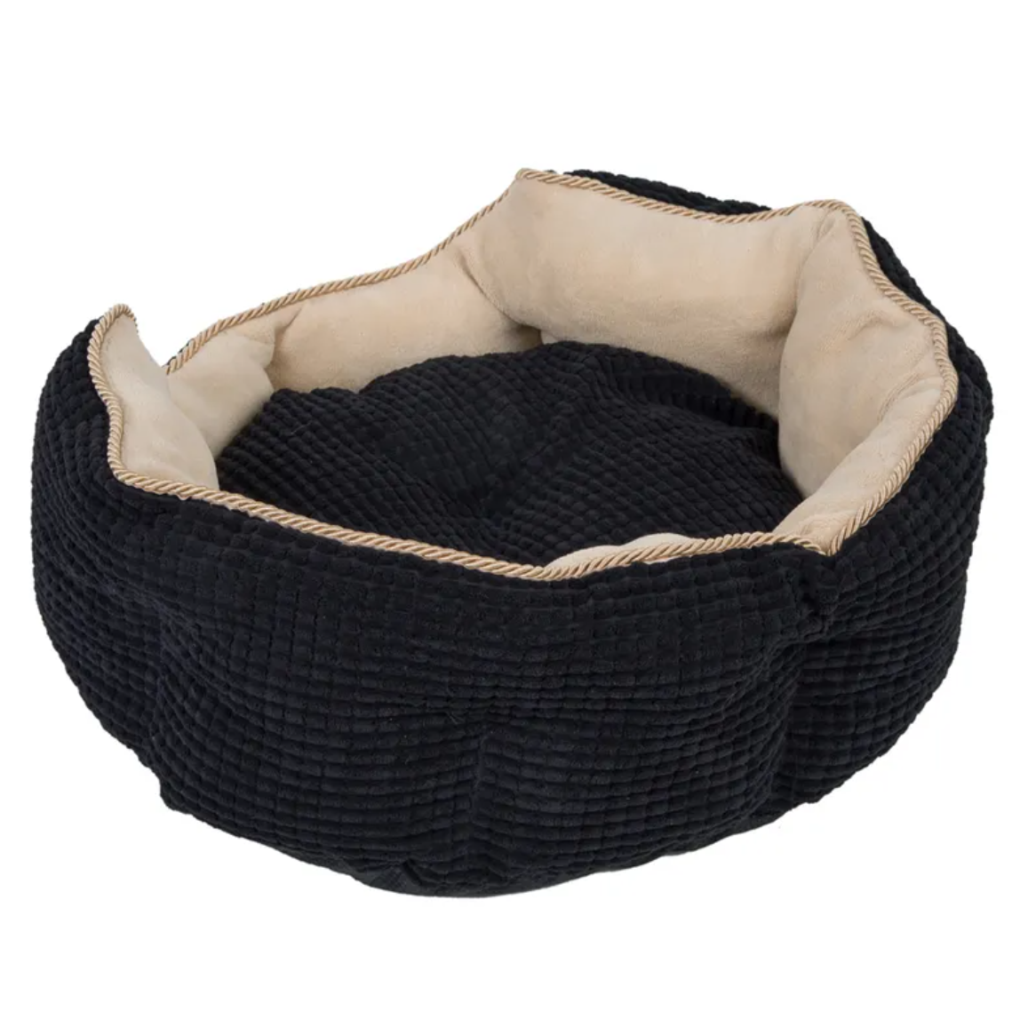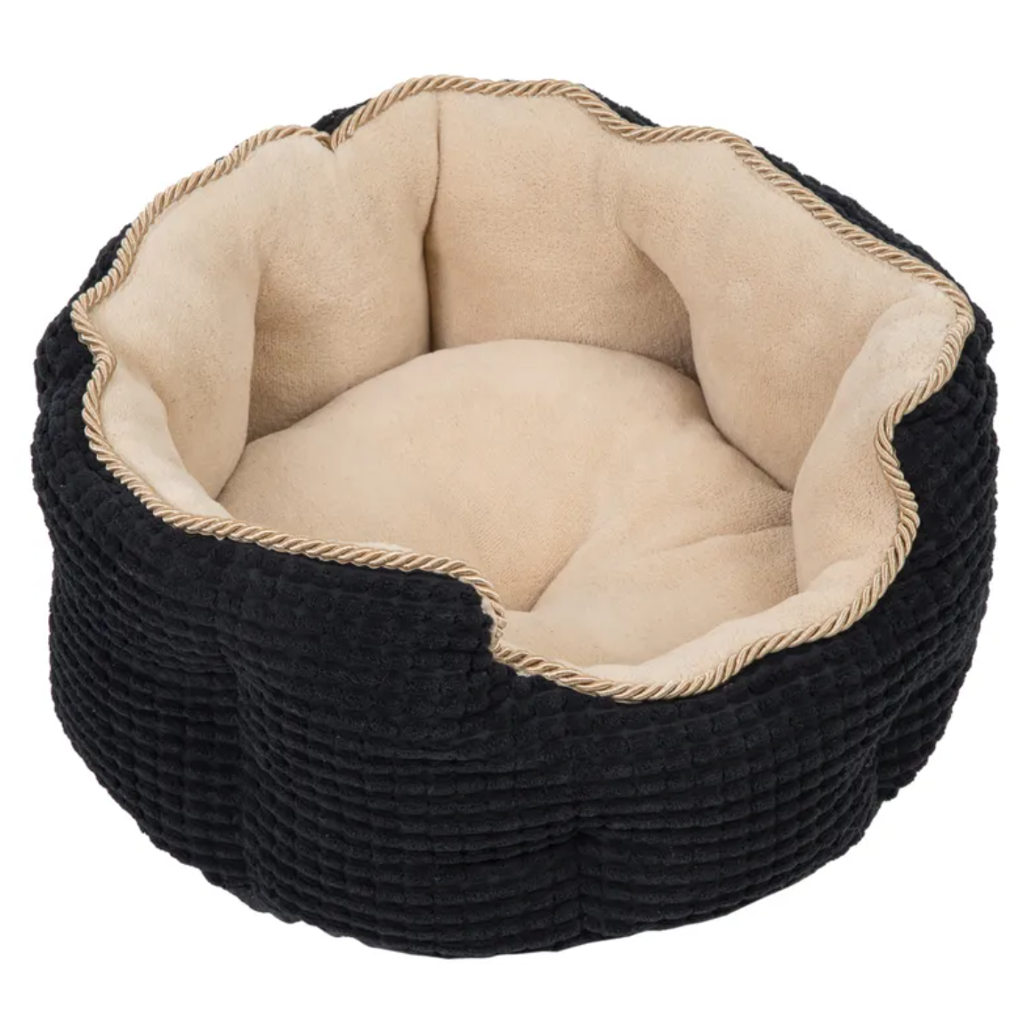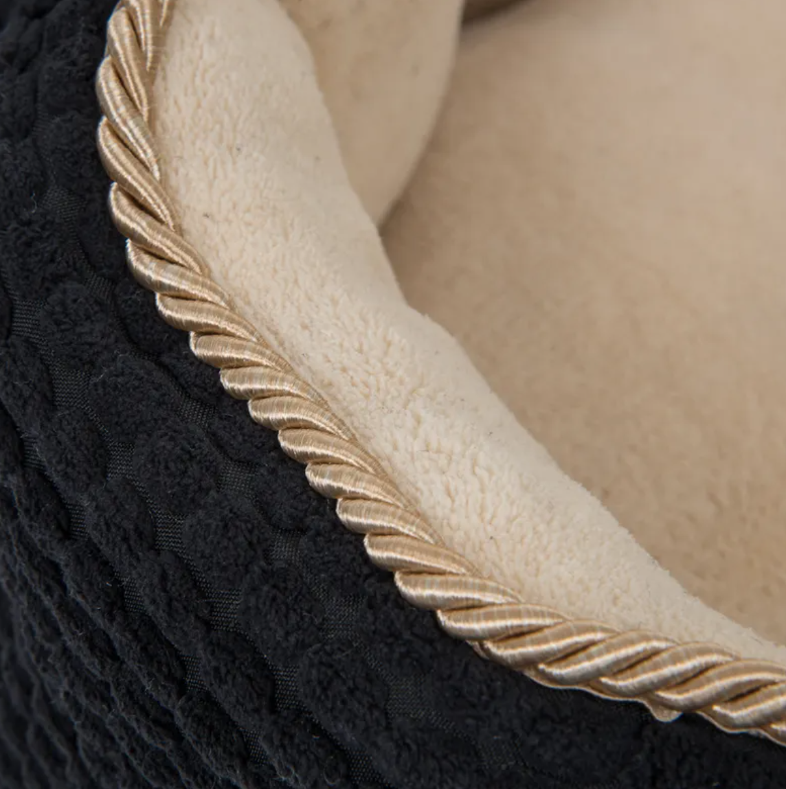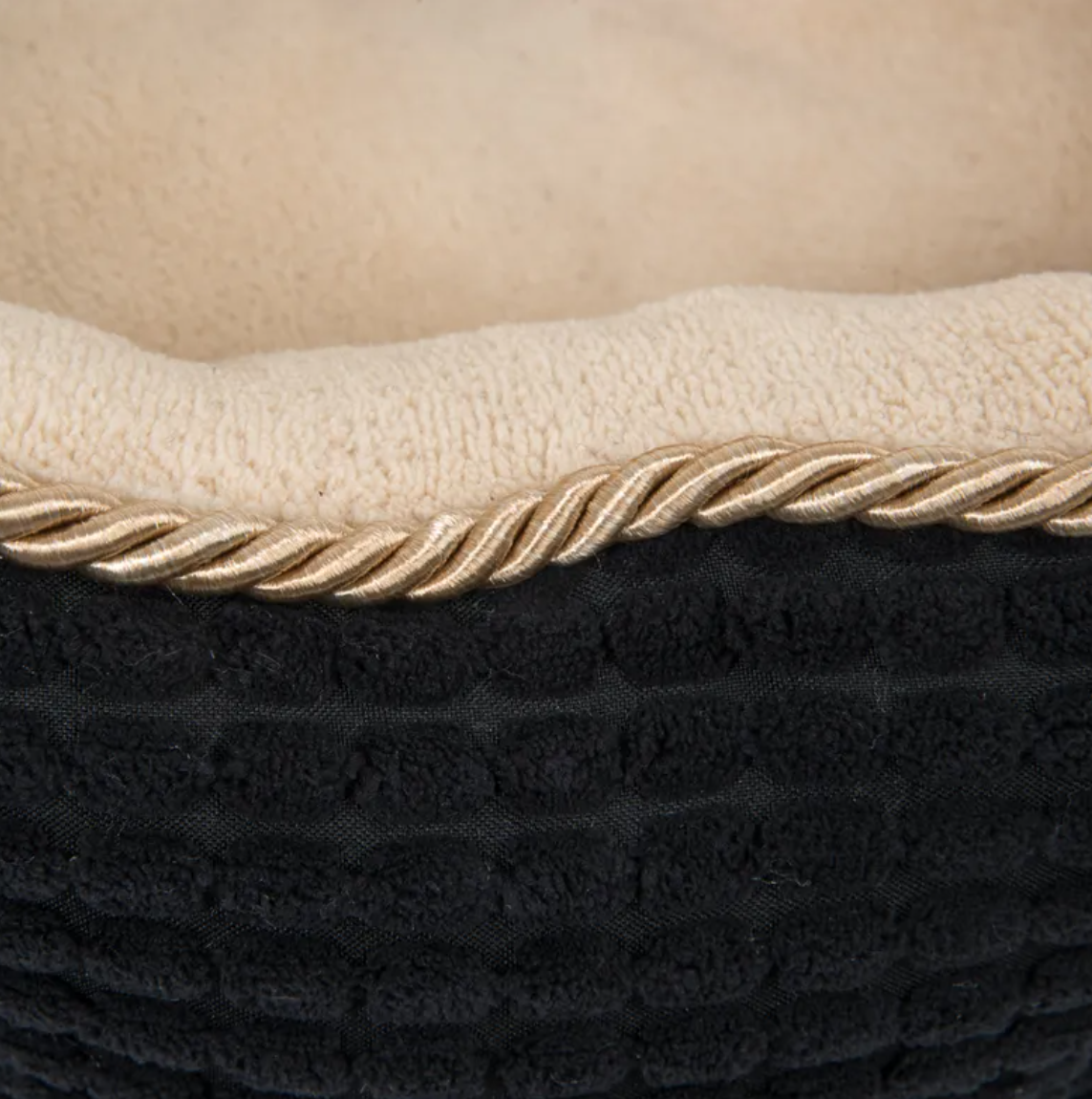 Díky kontrastu mezi černou strukturovanou vnější stranou se zlatou stužkou a světle béžovou vnitřní stranou z hřejivého fleecu působí pelíšek opravdu luxusně