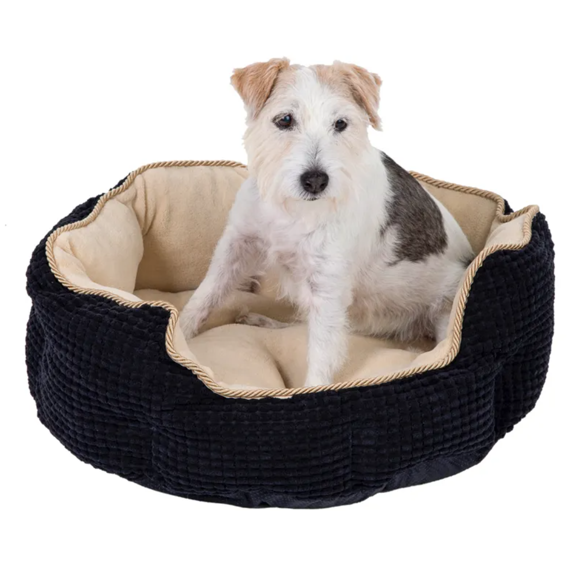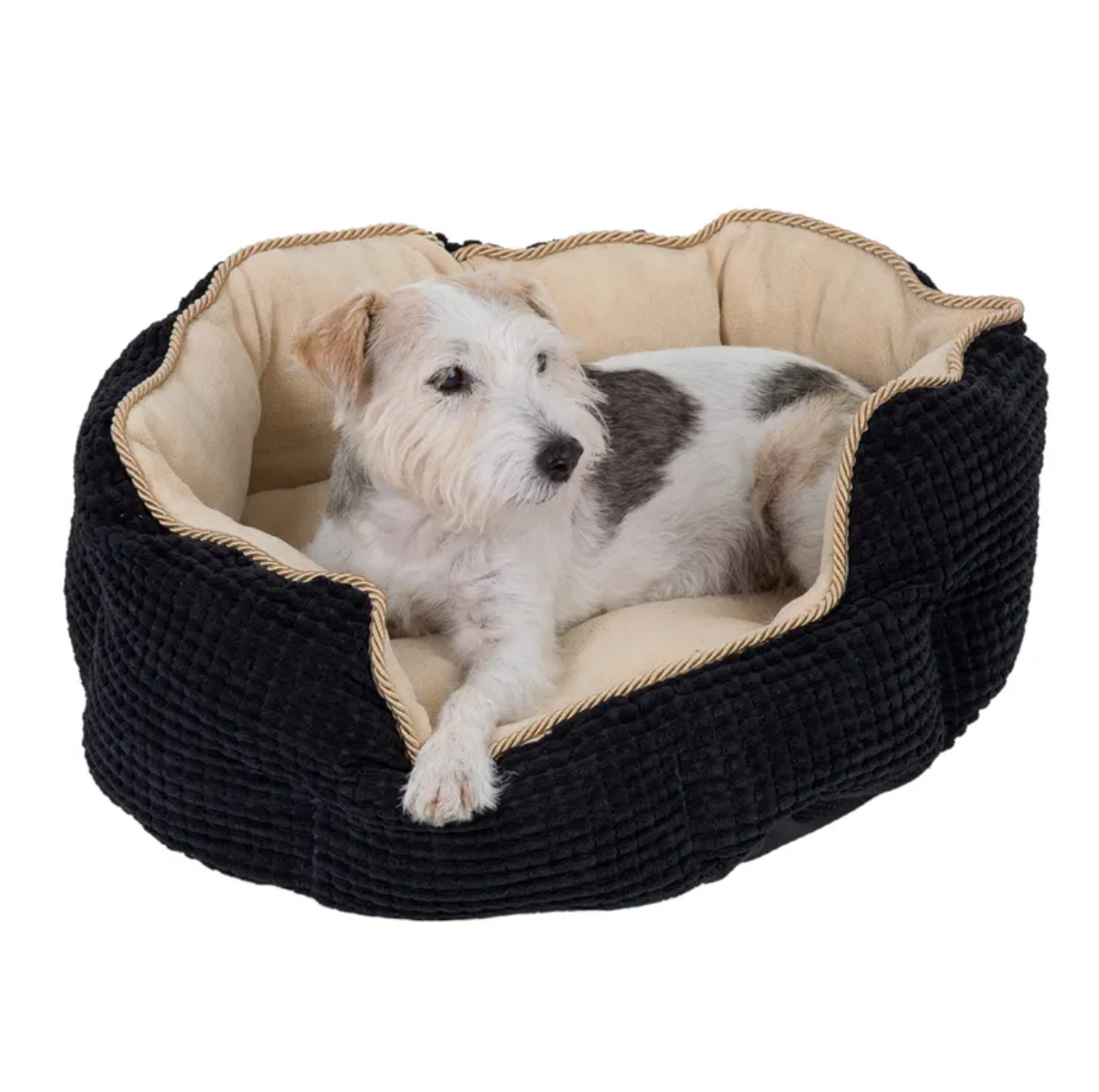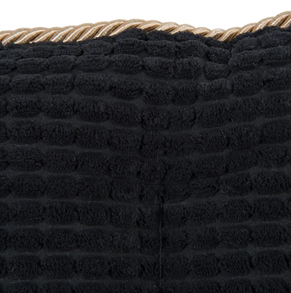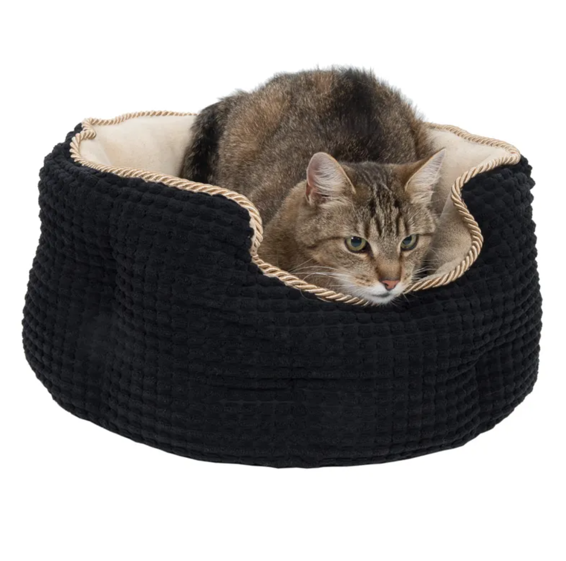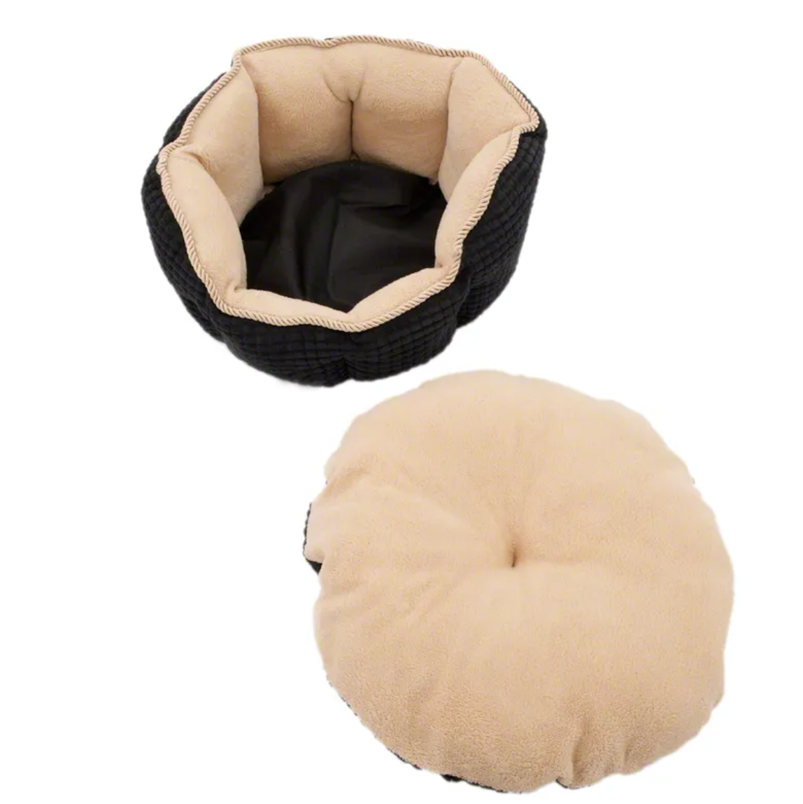 Díky kontrastu mezi černou strukturovanou vnější stranou se zlatou stužkou a světle béžovou vnitřní stranou z hřejivého fleecu působí pelíšek opravdu luxusně