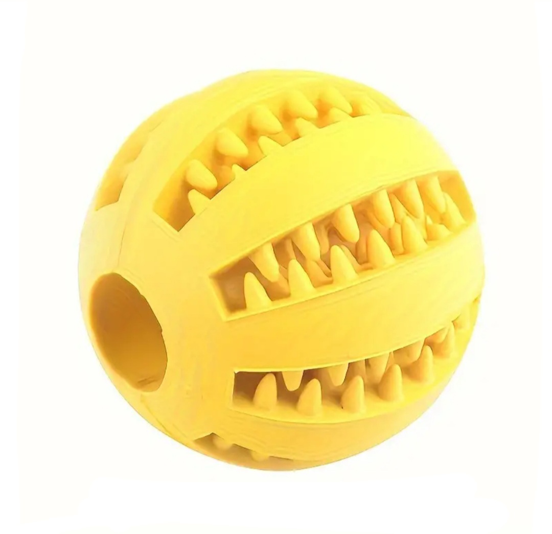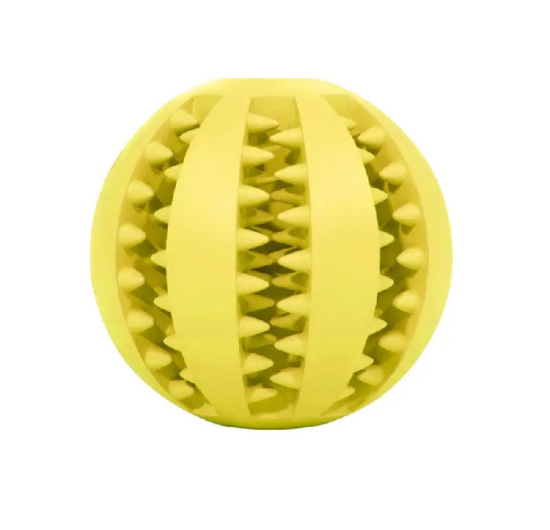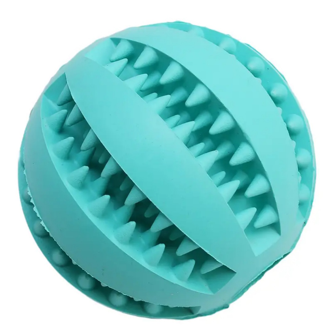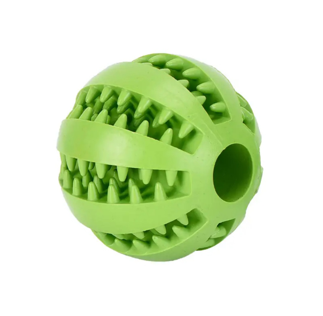 Díky speciálně navrženým výstupkům se míček stává přirozeným zubním kartáčkem. Čistí zuby i prostor mezi nimi při hraní – zabraňuje tak zubnímu kameni a zároveň masíruje dásně