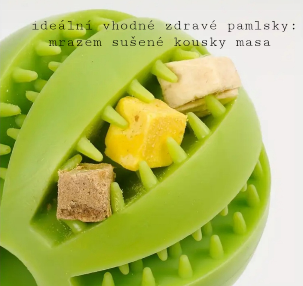 Dejte mezi "zuby" míčku třeba kousek pamlsku, Váš pejsek se při dobývání odměny zabaví a ještě – kromě svých chuťových buněk – zabaví i svou hlavičku