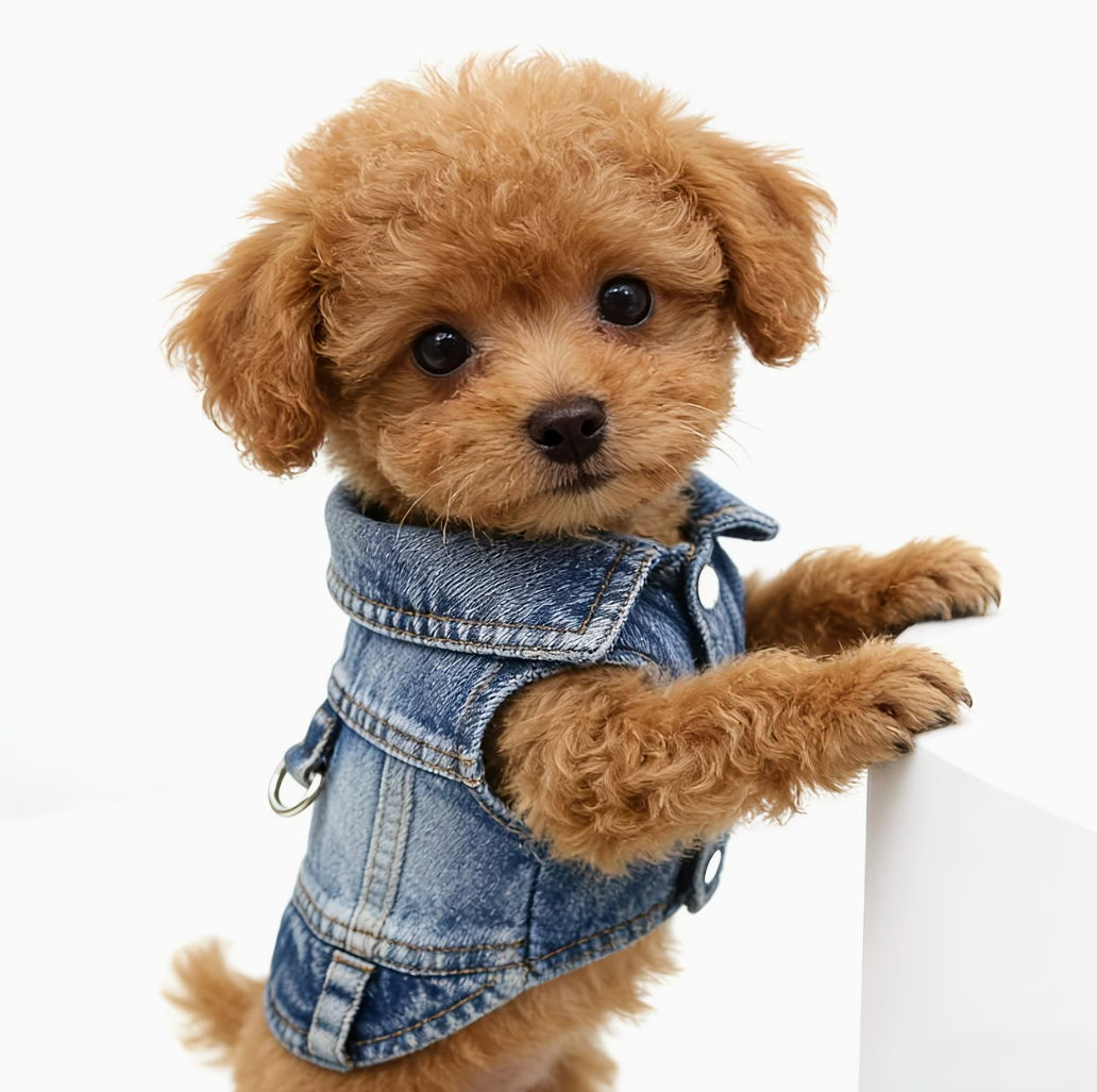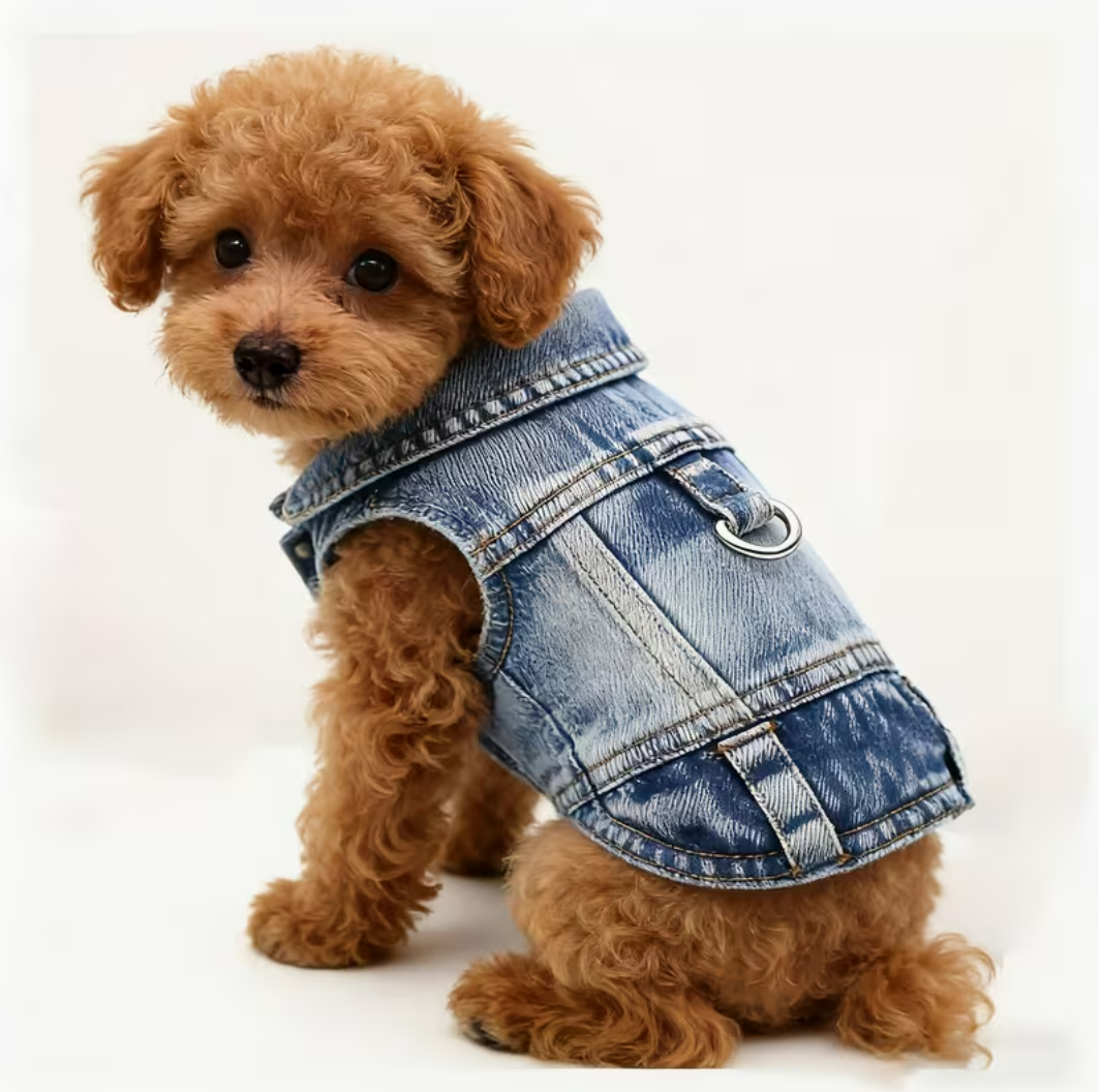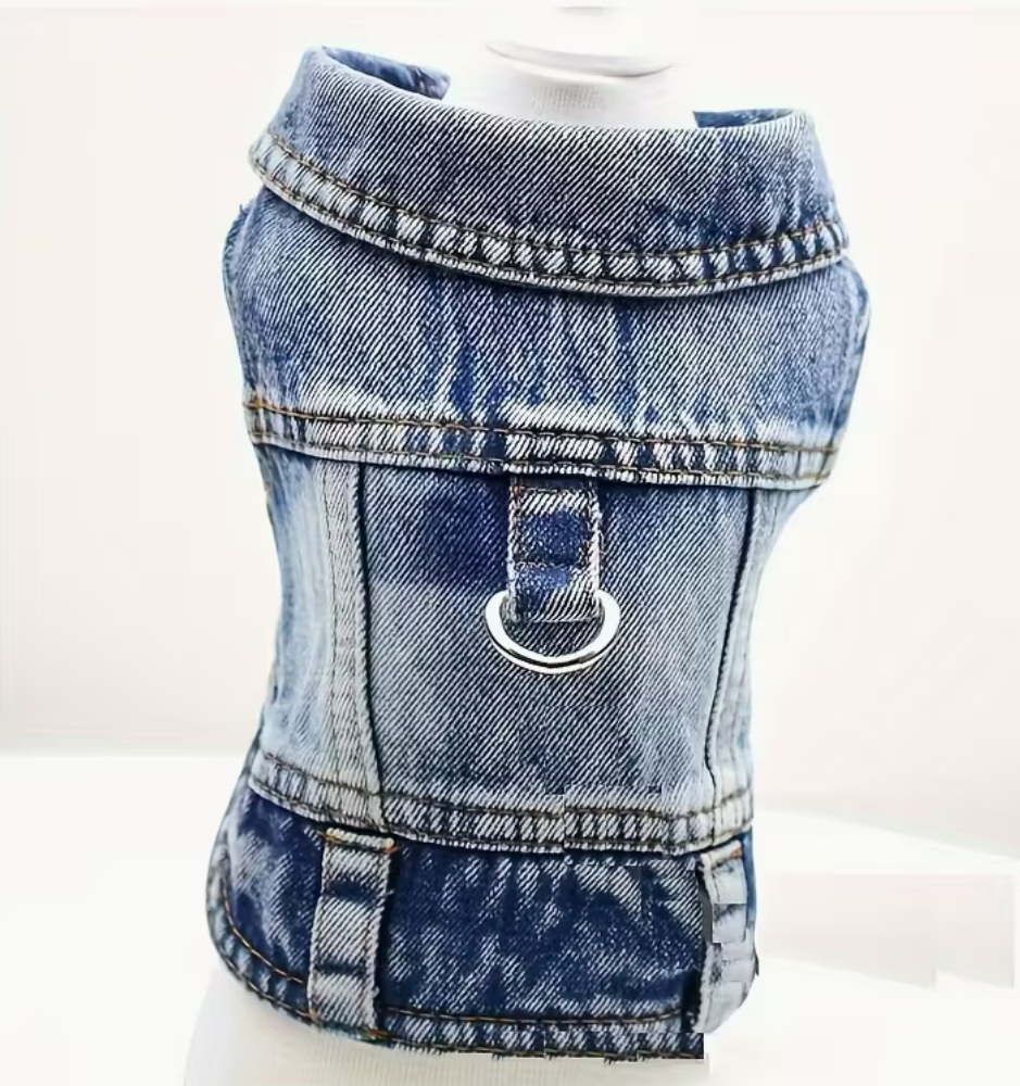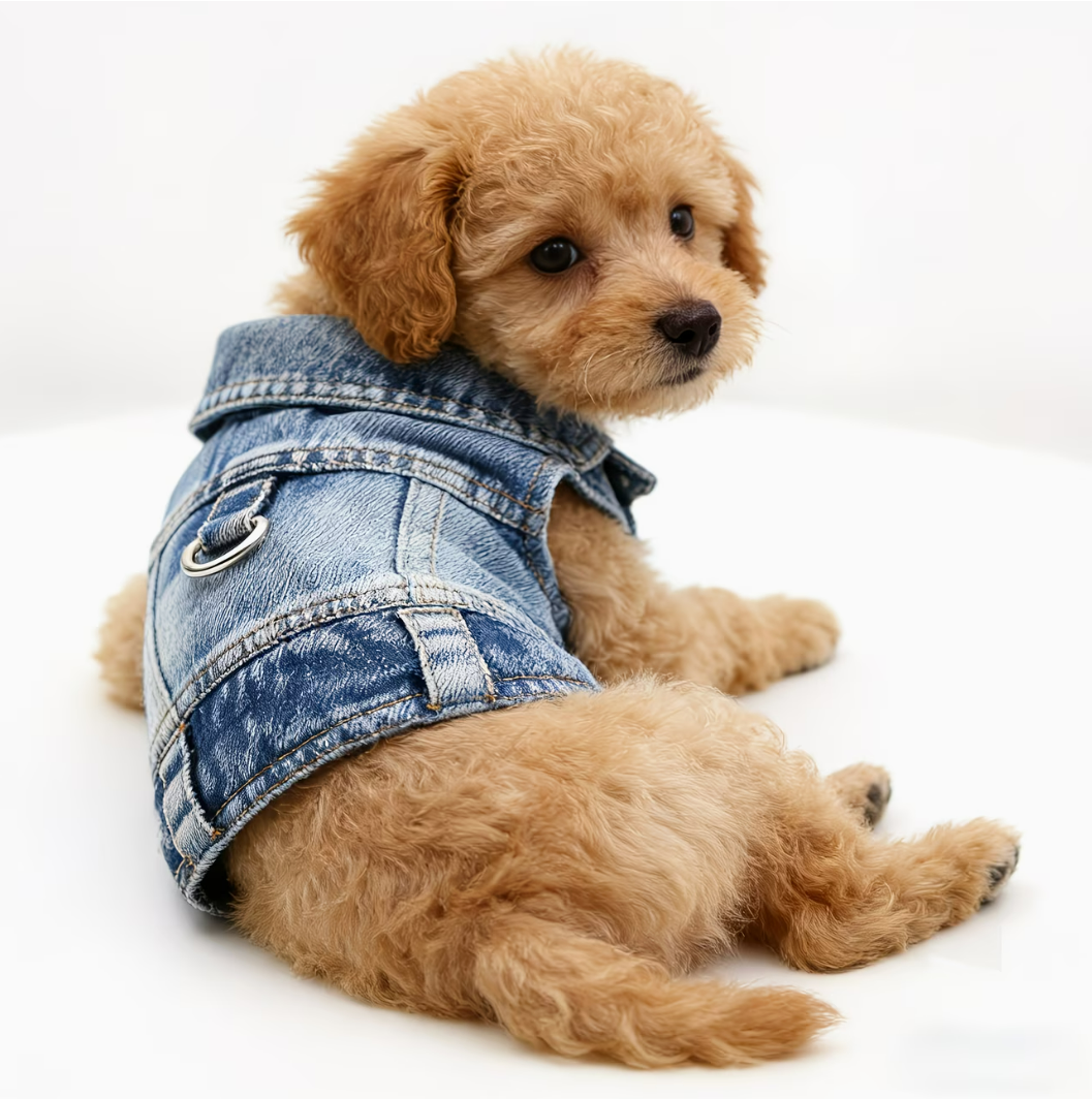 Vhodná i při dešti, klasický materiál 100% bavlna jeans je silný a hned tak nepromokne, na venčení a vycházky ideální