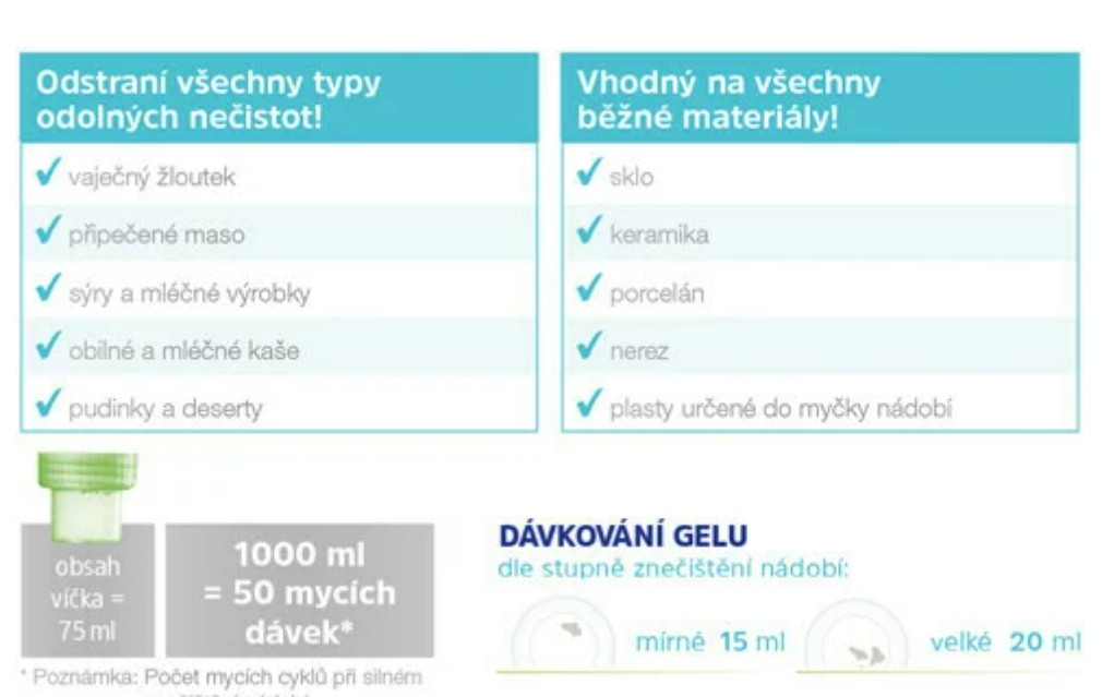 Gel umožňuje variabilní dávkování: 15-20 ml dle míry znečištění nádobí