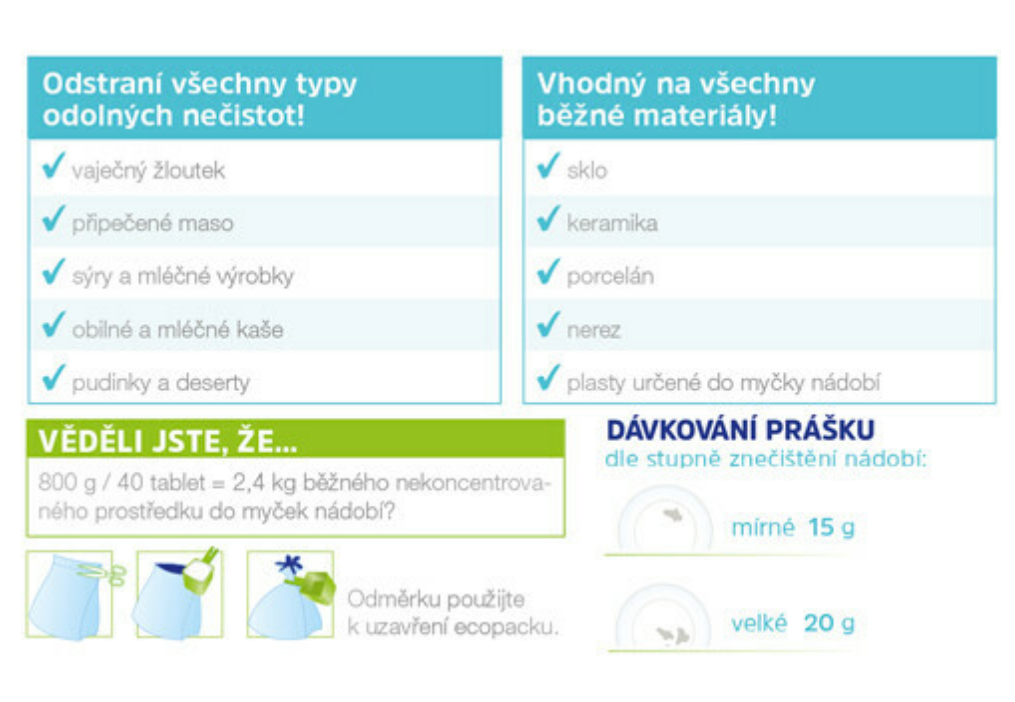 Prášek umožňuje variabilní dávkování 15-20 g dle míry znečištění nádobí.