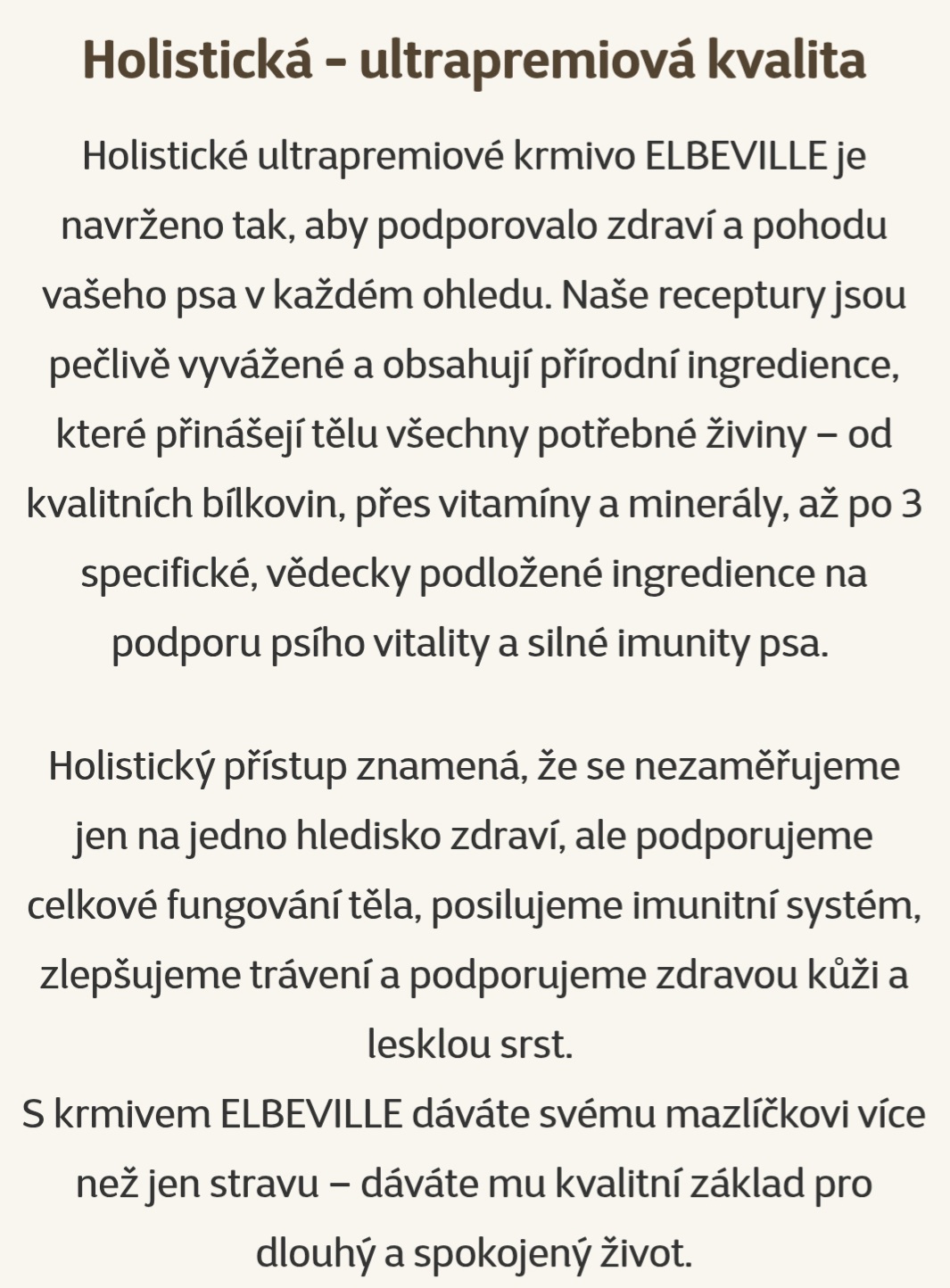 - Krmivo bylo vyvinuto v souladu holistickým pohledem na každodenní potřeby psa tak, aby zajistilo jeho vitalitu, imunitu a zdravé prospívání