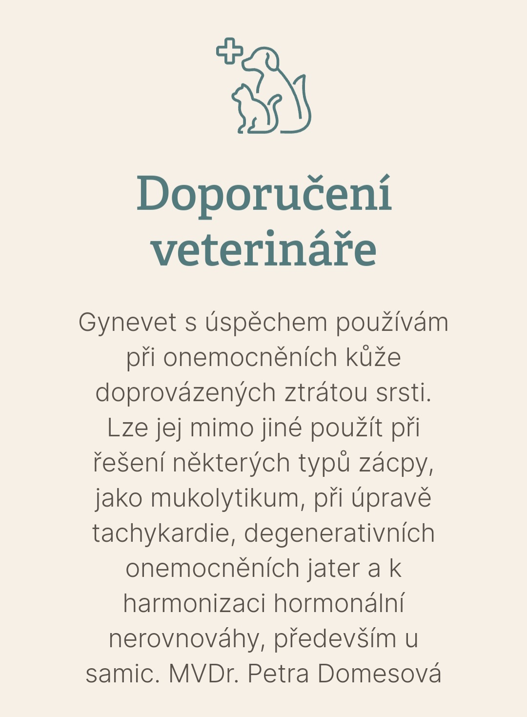 - Zánětlivé stavy na kůži – vyrážky, ekzémy a povrchová poranění (pomocné preparáty Gynevet, Regavet, Kingvet)