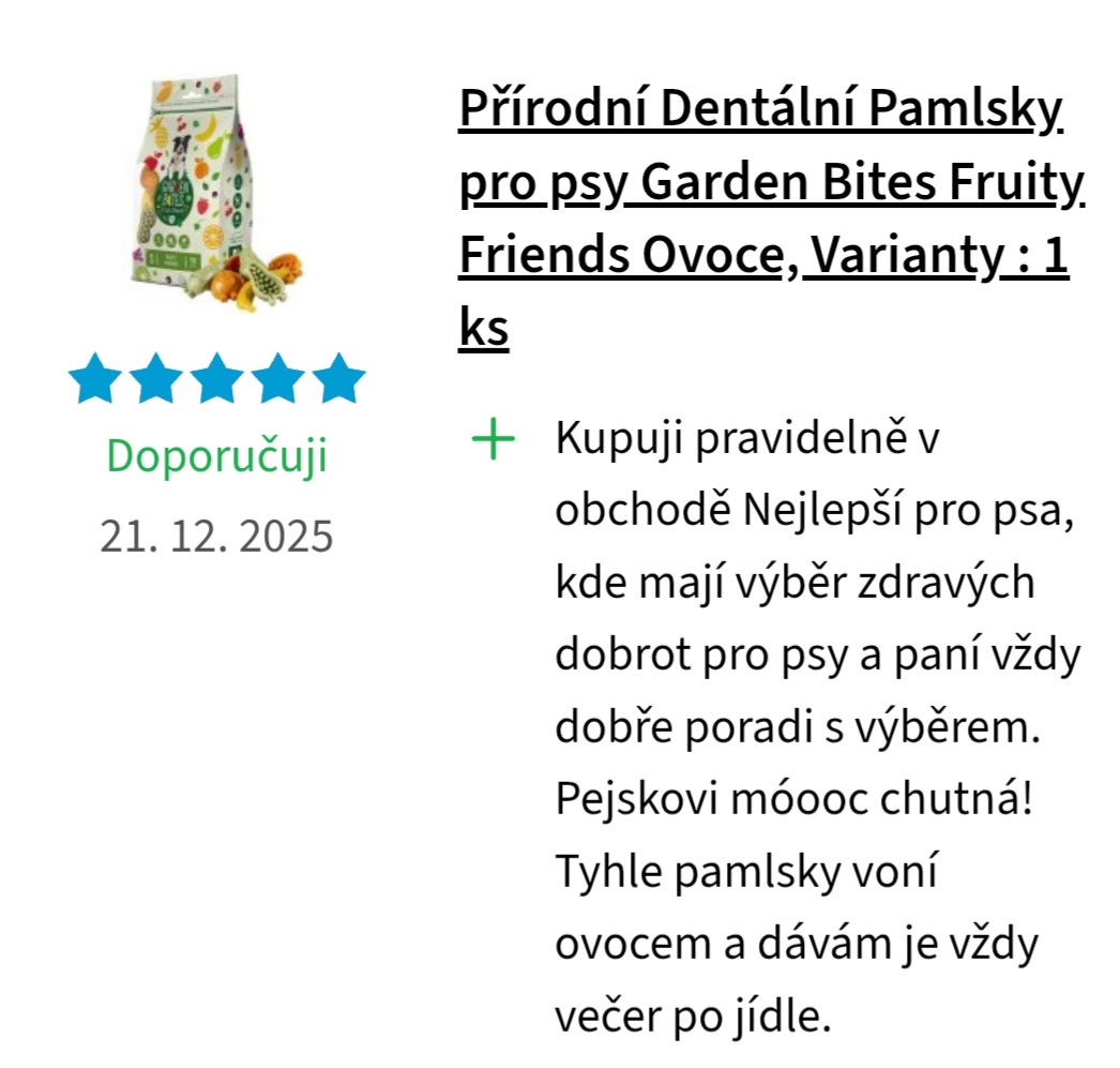 Našim holkám jorkšírkám tento dentální pamlsek moc chutná a vím, že jim dávám zdravou pochoutku, která jim pečuje o zuby a dásně