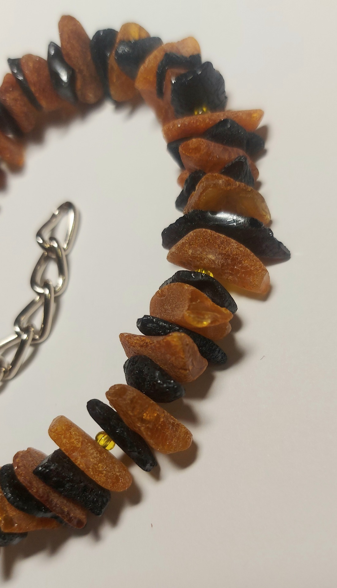 Materiál: pravý surový baltský jantar tmavě hnědé a medové barvy mix, přírodní kůže, nerezový řetízek a karabina