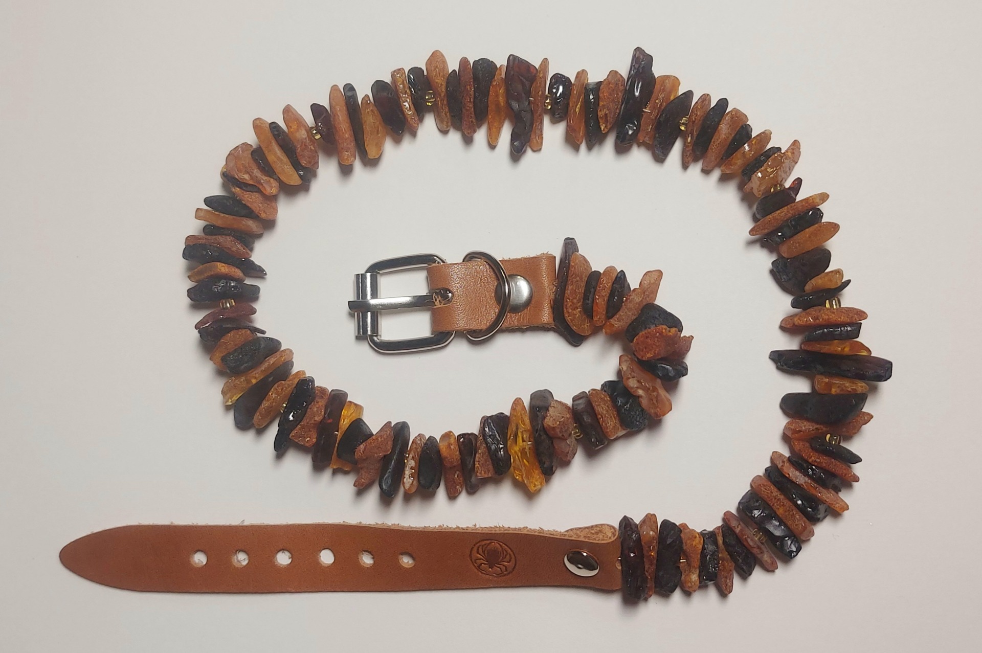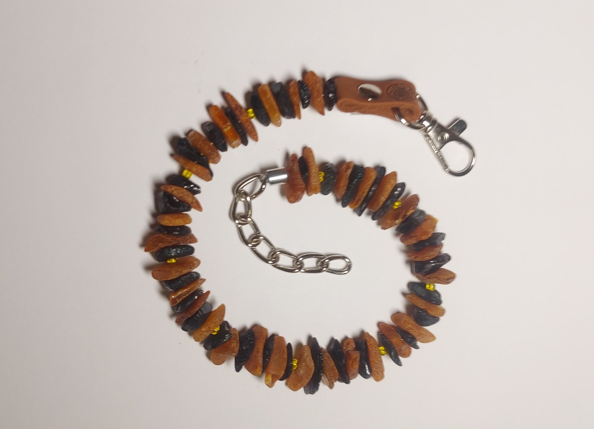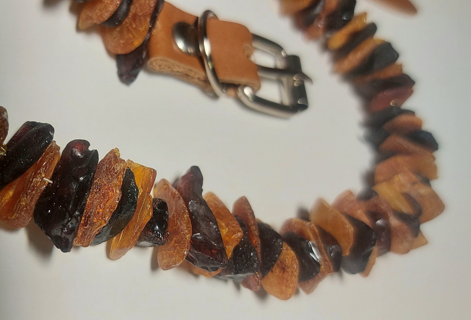 Obojek s minerály baltský jantar s koženým páskem, nerezovým řetízkem a karabinou