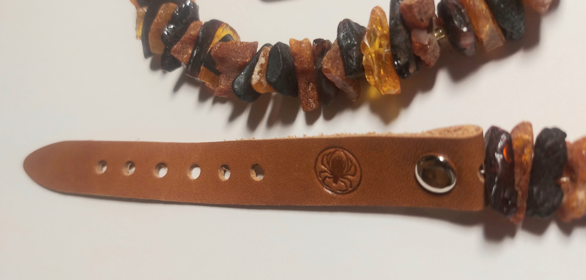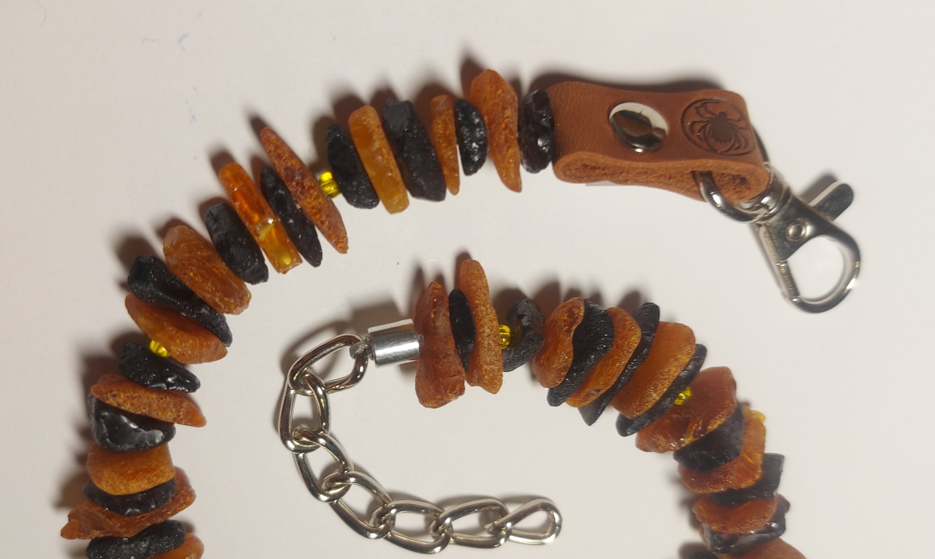 Materiál: přírodní minerál baltský jantar, přírodní kůže, nerezová karabina a řetízek