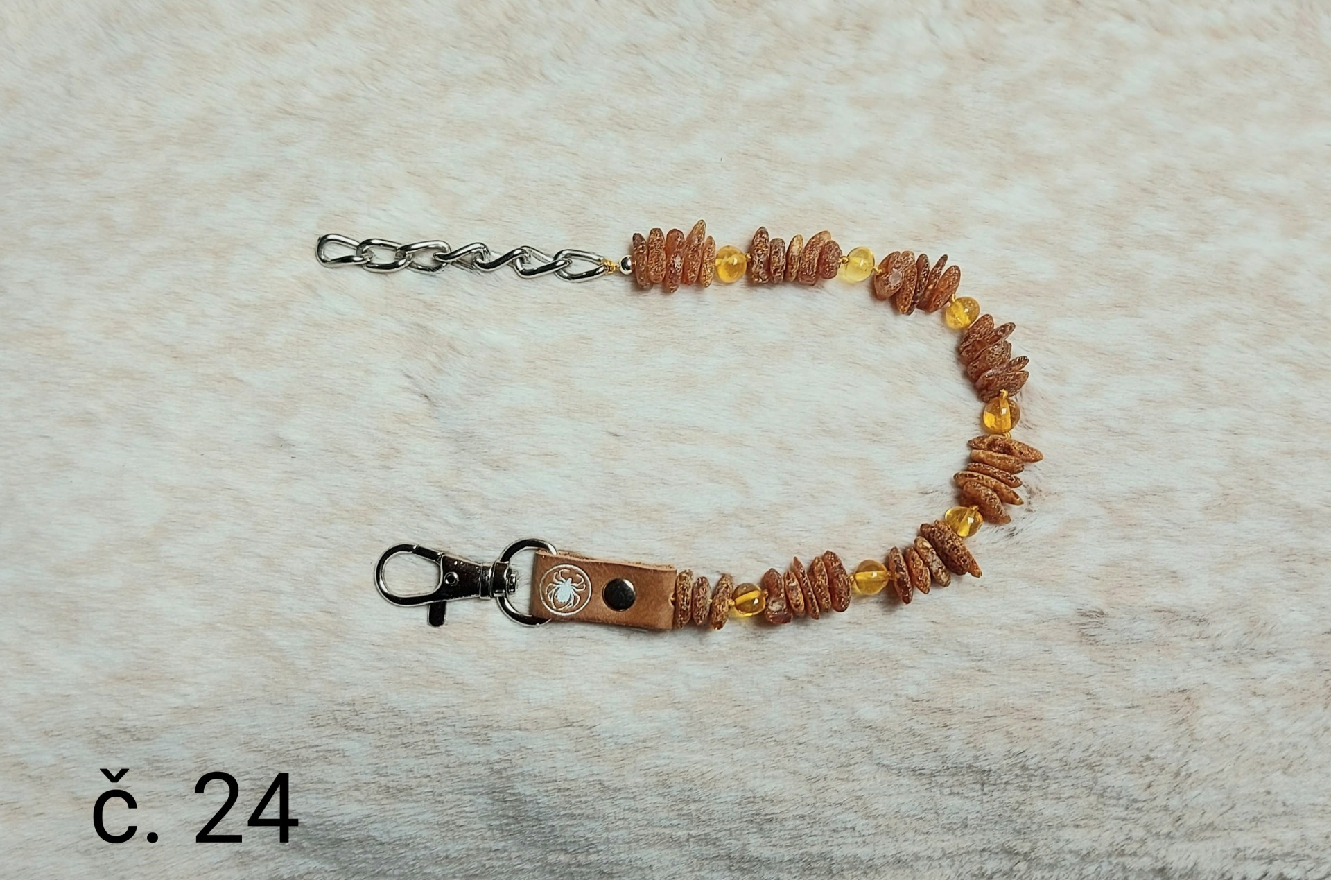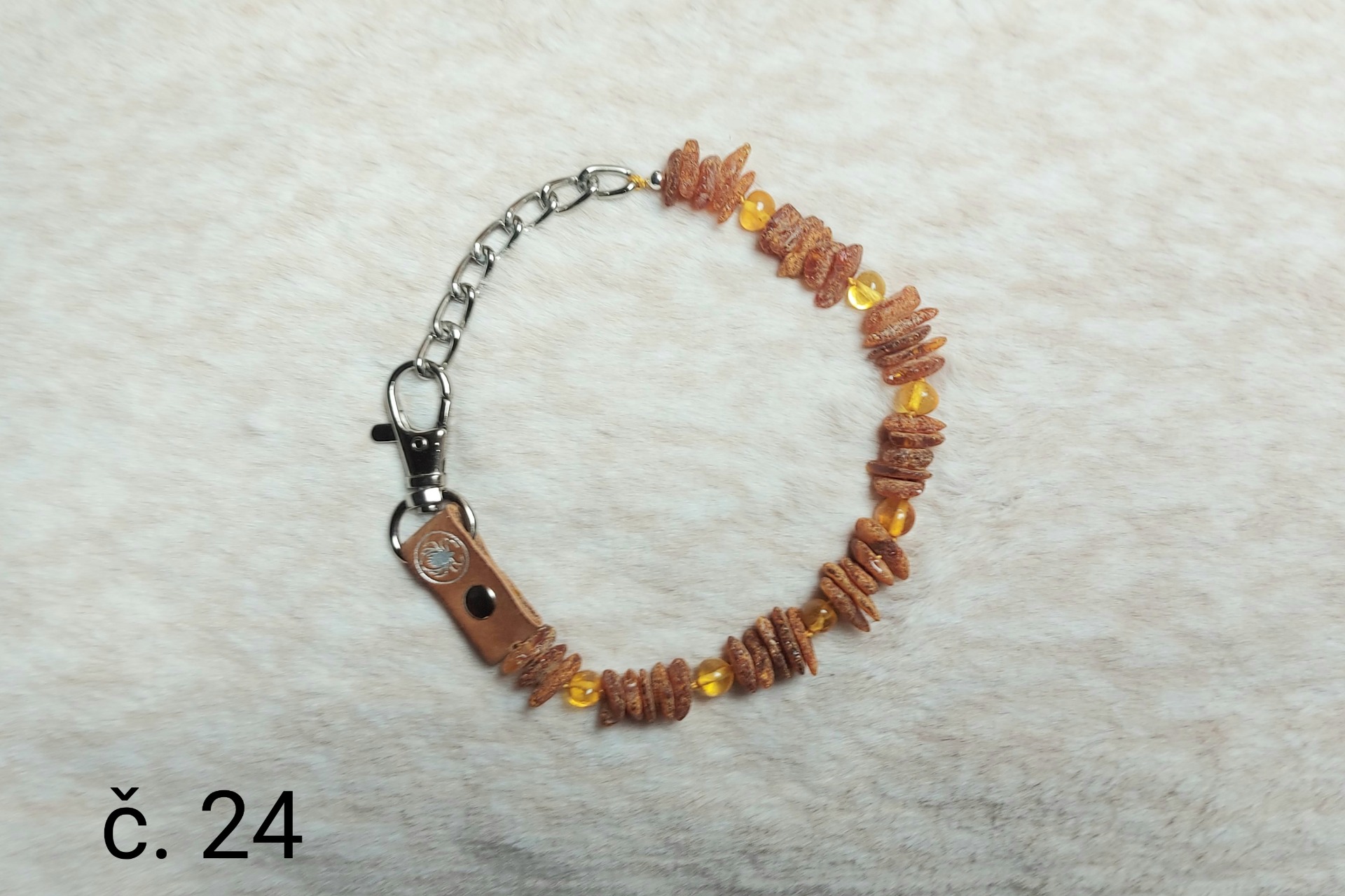Materiál: přírodní minerál baltský jantar, přírodní kůže, nerezová karabina a řetízek