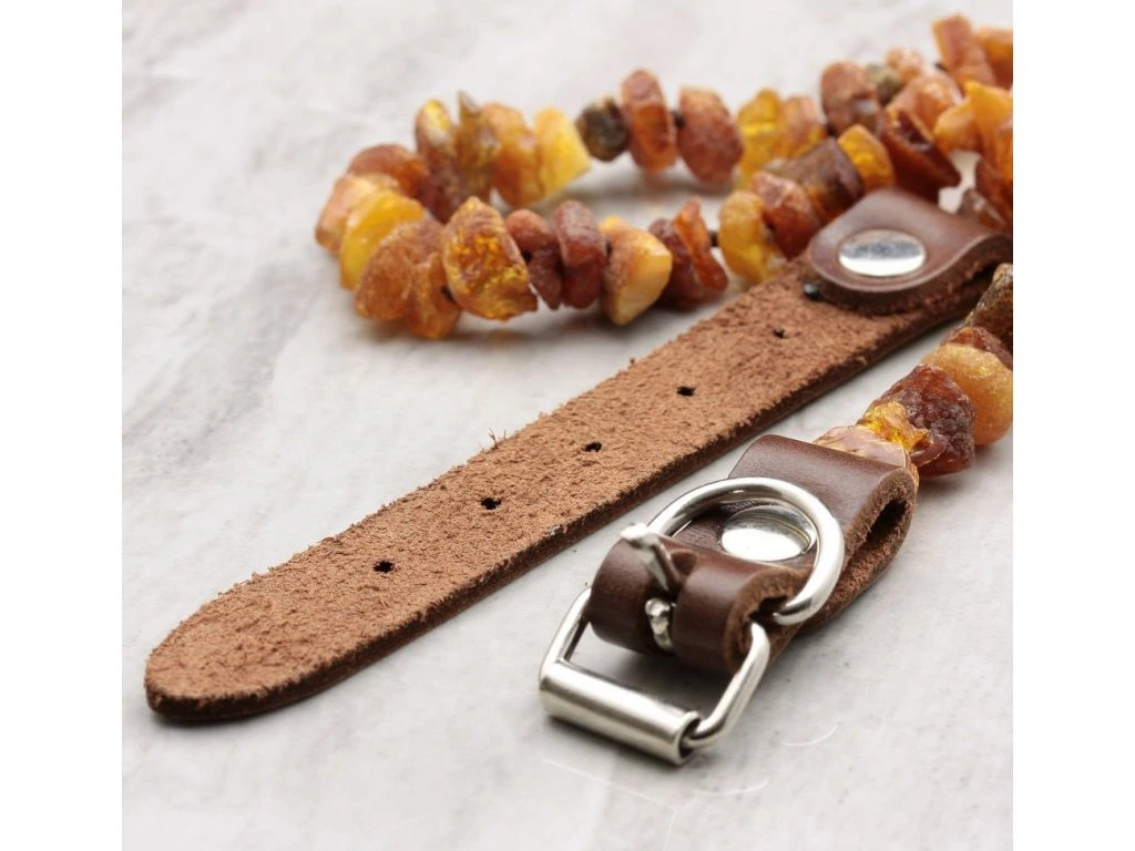 Materiál: pravý surový Baltický jantar medové barvy, přírodní kůže, nerezová přezka