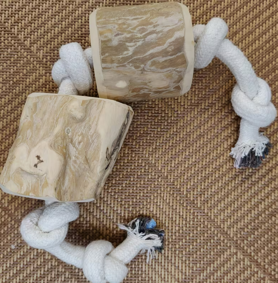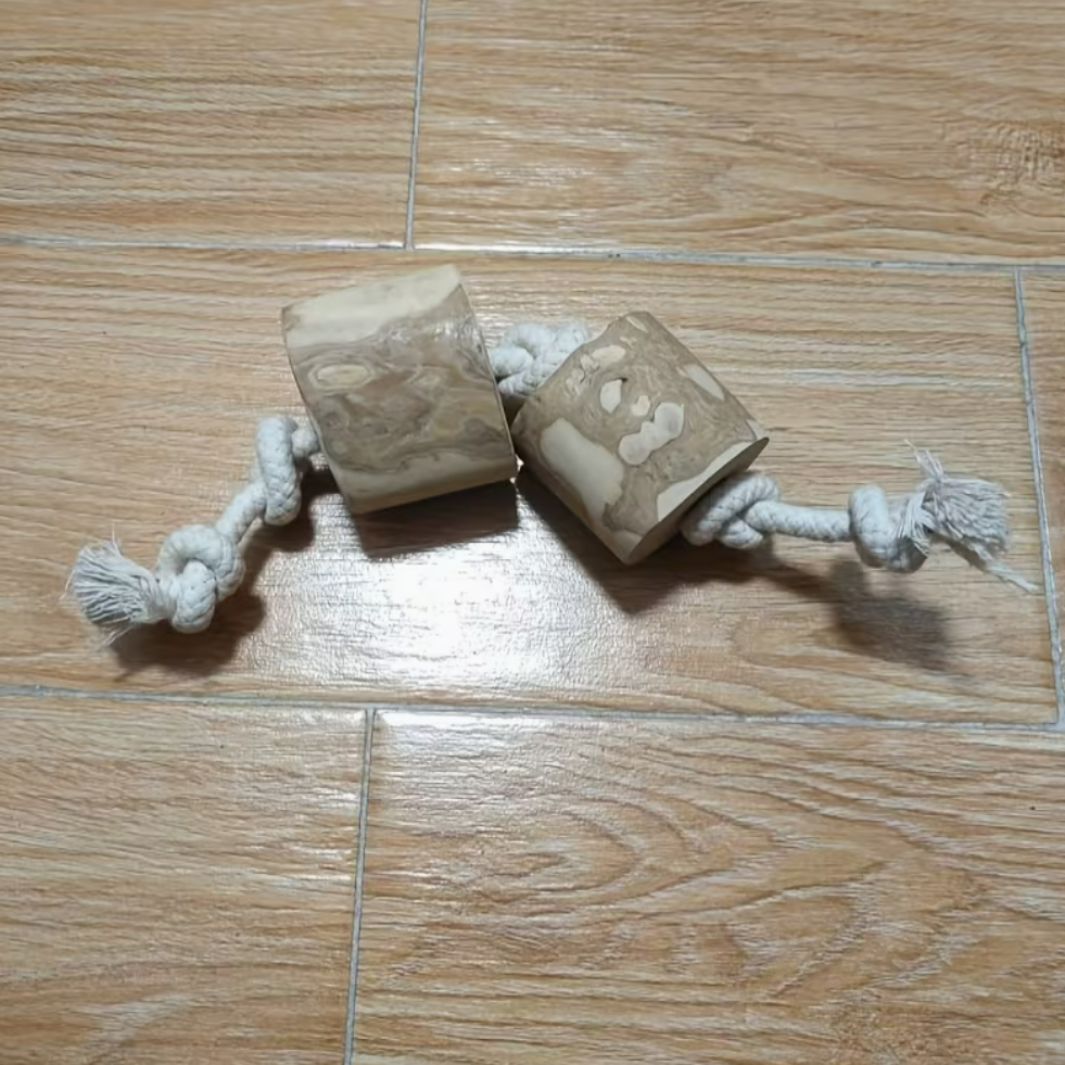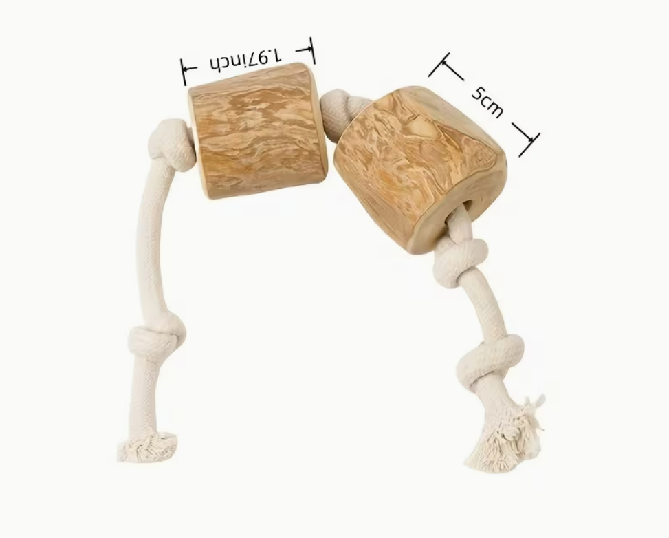 Díky své tvrdosti a tvaru bude žvýkací dřevo na bavlněném laně pro Vašeho psa vzrušující hračkou, kterou s sebou může nosit všude