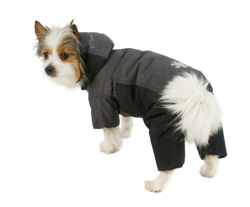 Kombinéza kryje všechny nohy pejska, který je dokonale v suchu a teple i v tom největším mrazu