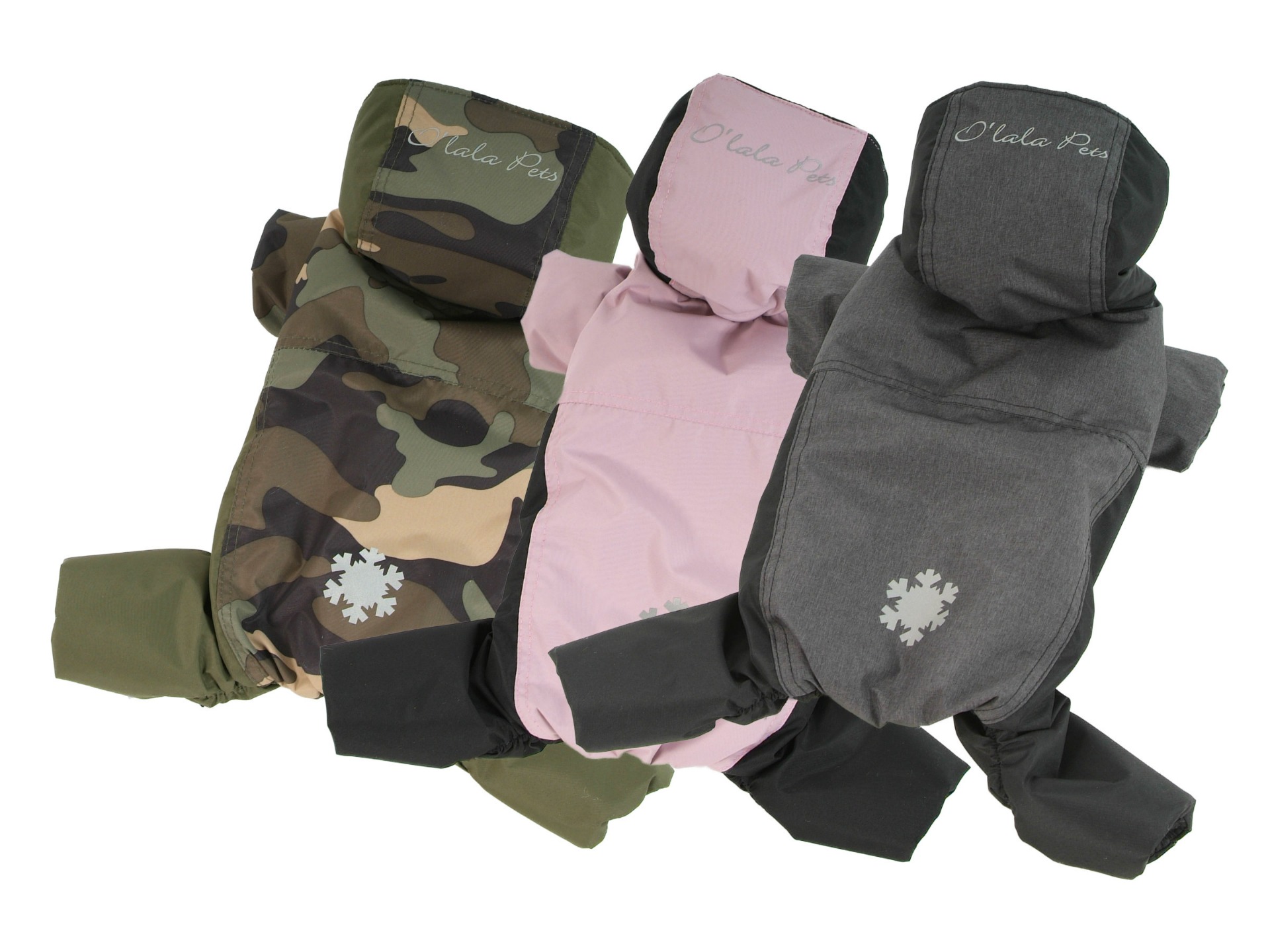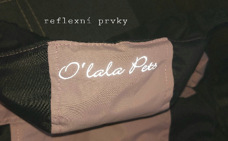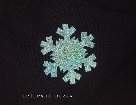 Na kombinéze na zádech REFLEXNÍ výšivka vločky, na kapuci reflexní výšivka Ó lala pets