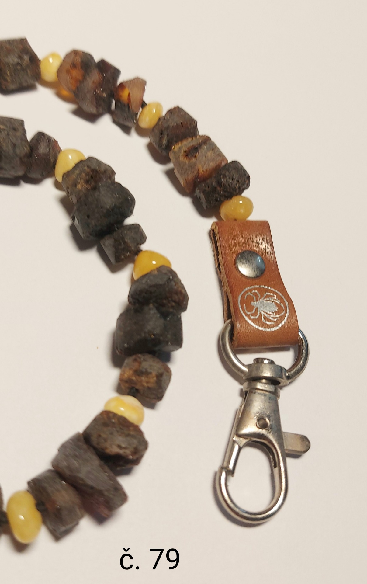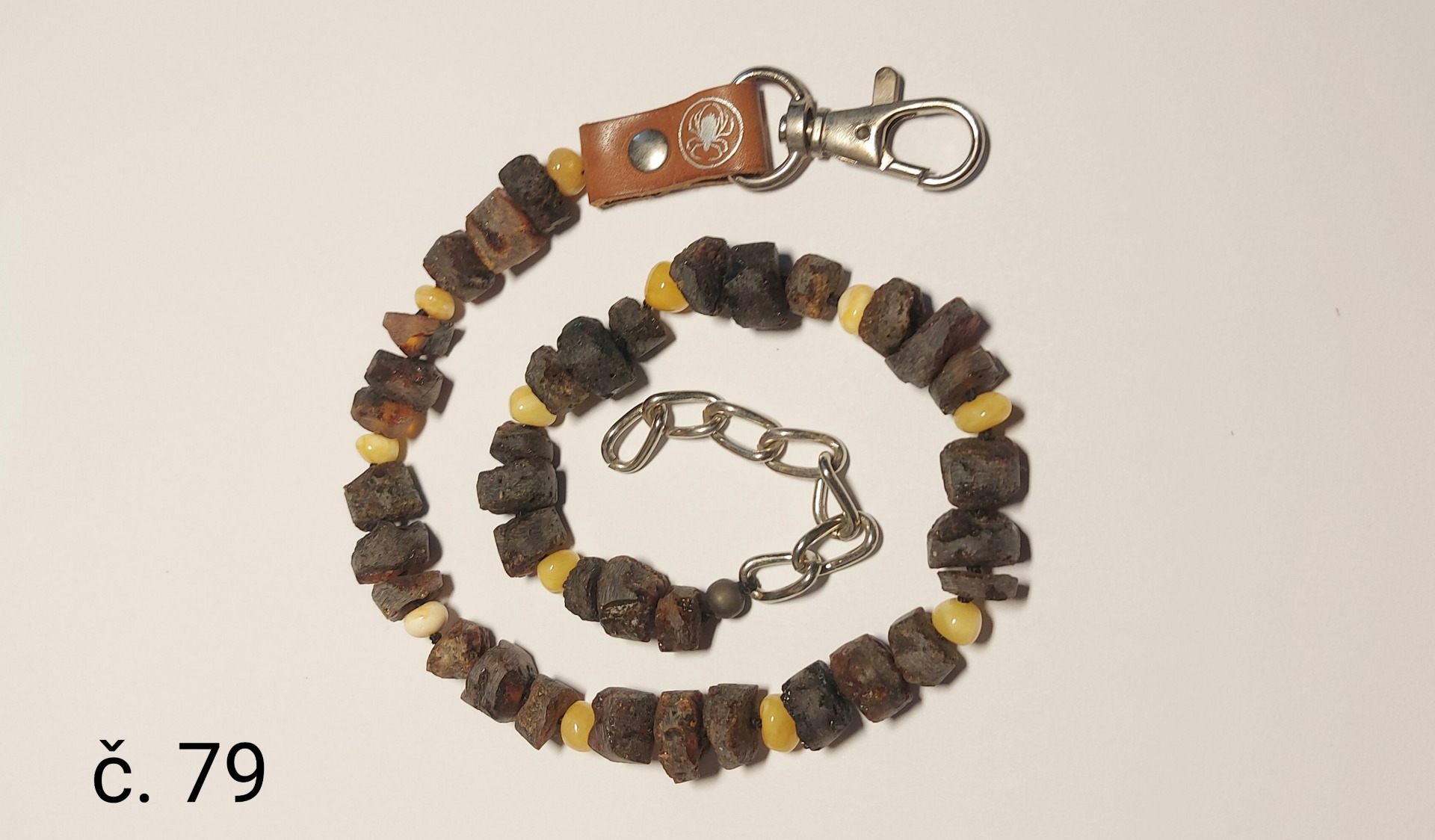 Materiál: přírodní minerál baltský jantar, přírodní kůže, nerezová karabina a řetízek