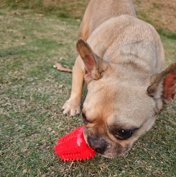Pejsek si olizováním a žvýkáním hračky zároveň vyčistí zuby