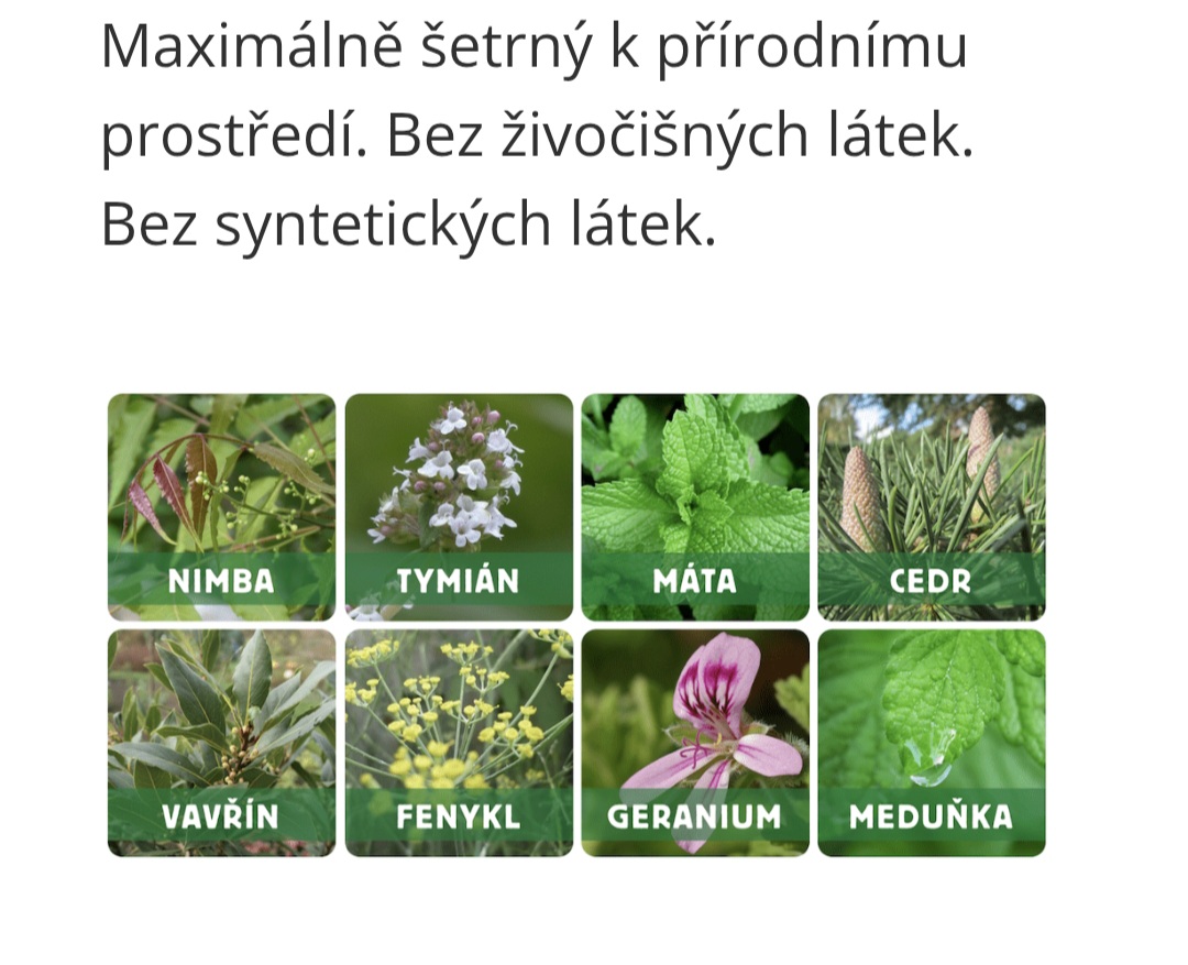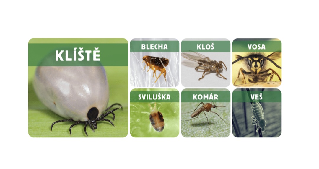- prevence a odpuzování od vnějších parazitů jako jsou klíšťata, hmyz, blechy, komáři, mouchy nebo muchničky u zvířat starších 3 měsíců a oslabených a citlivých zvířat
