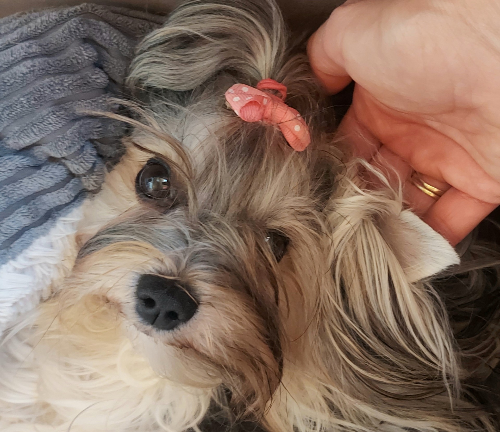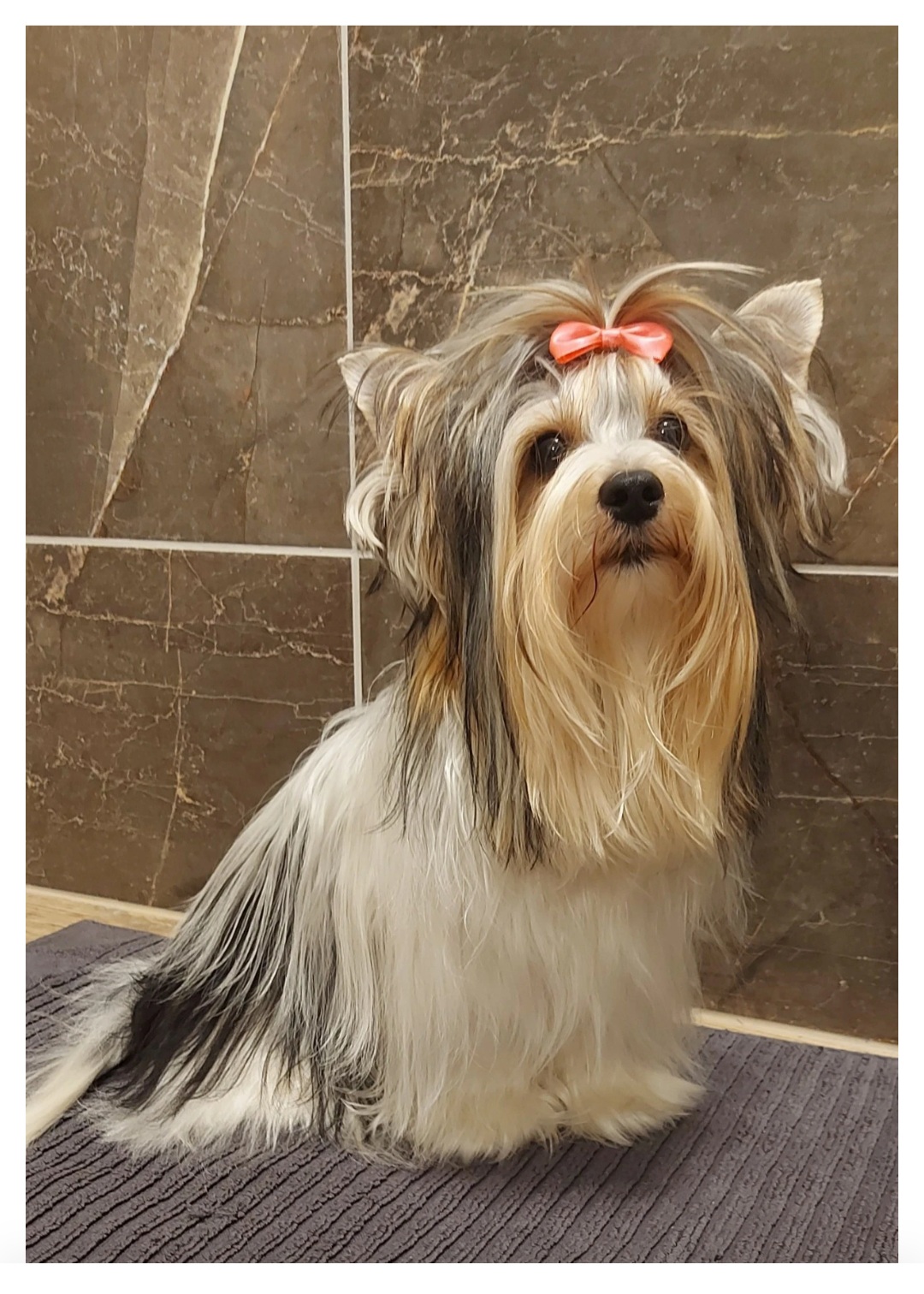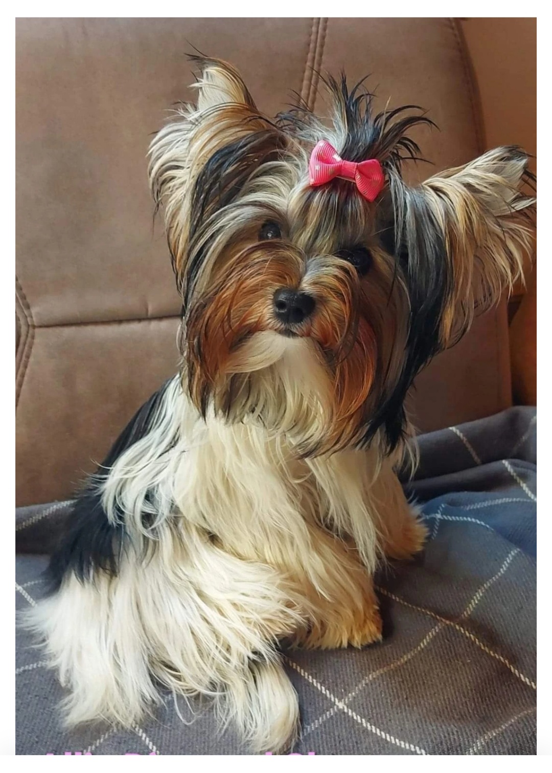 U jorkšírských teriérů je dobré oholit uši co nejvíce z obou stran, srst poté doroste a jakmile uši stojí, stříhejte jen špičku ucha (tvaru trojúhelníku 2x2x2 cm) viz fotogalerie - modelka Allie