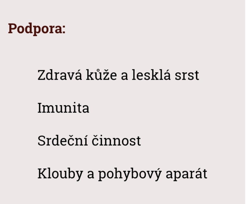 Napomáhá výrazně ke zlepšení kvality kůže a srsti, kloubů a pohybového aparátu