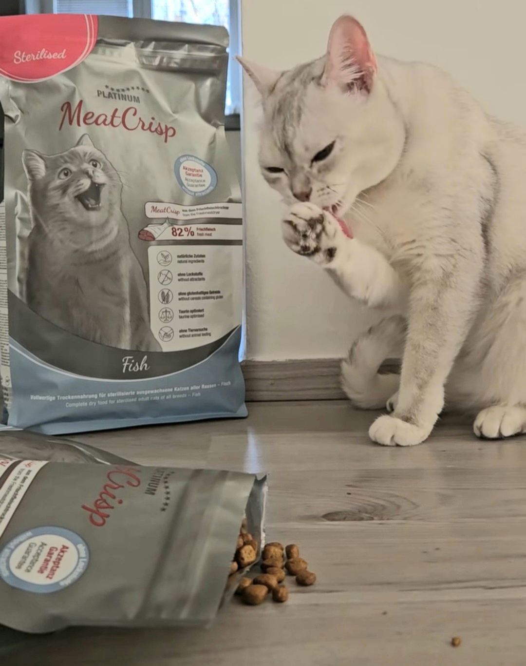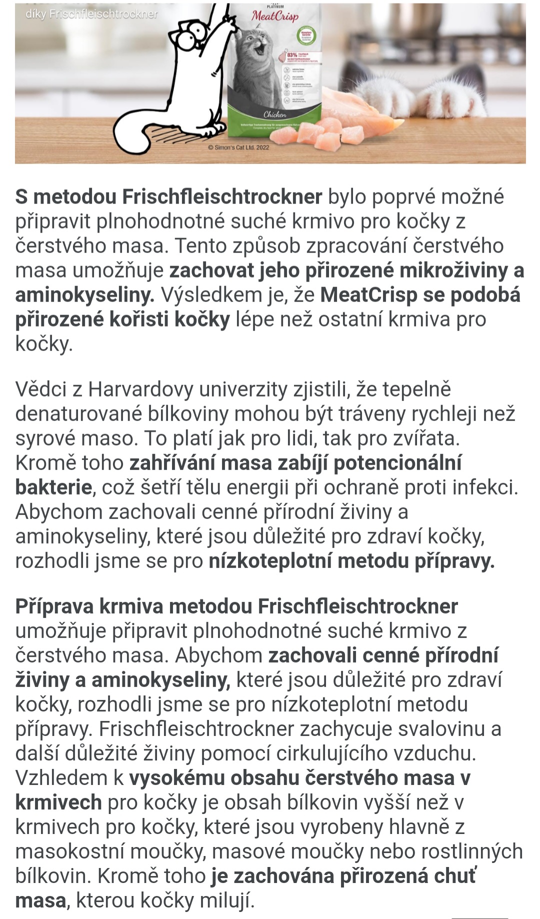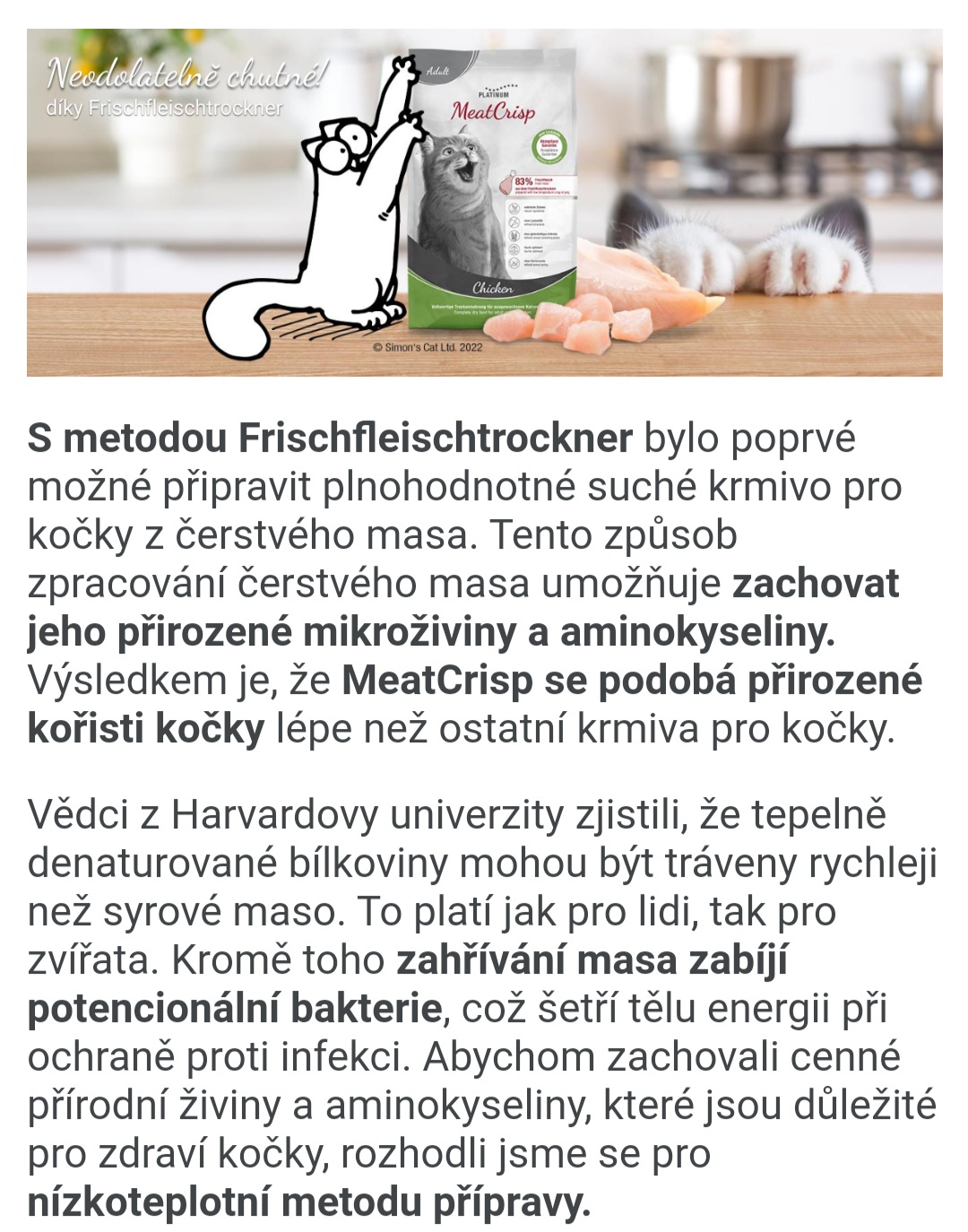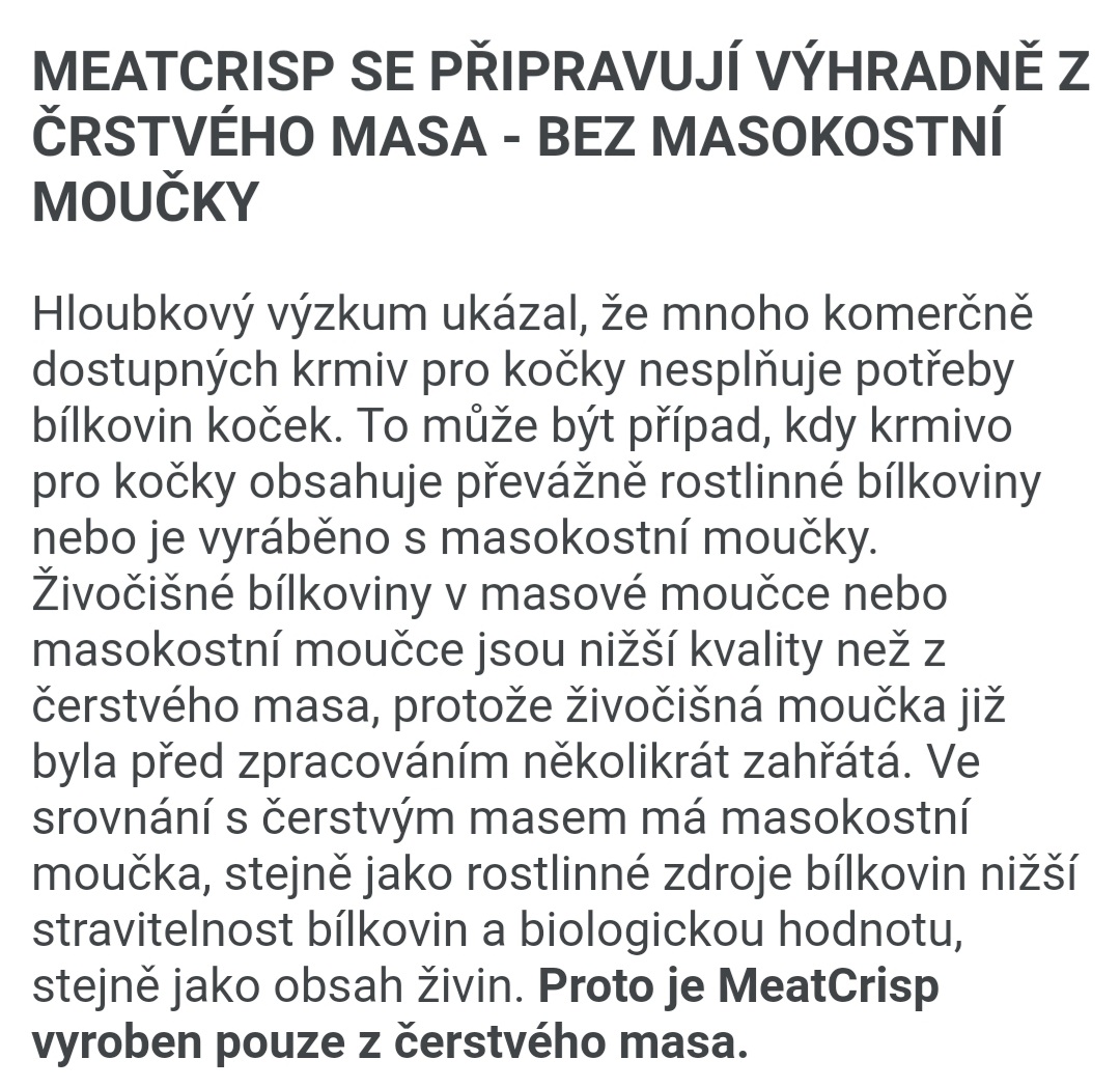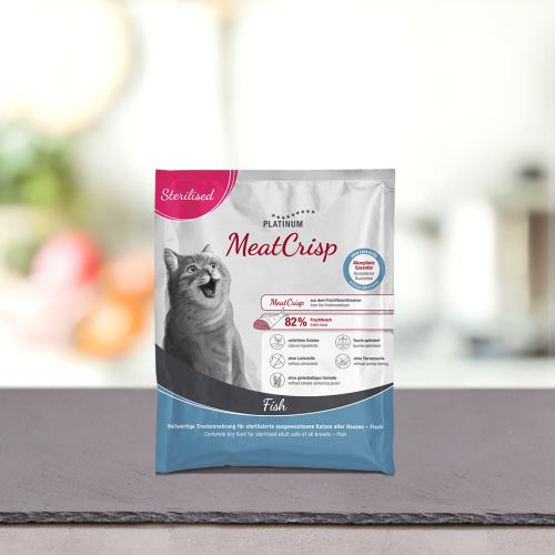 Platinum Cat Meatcrisp je plnohodnotné krmivo pro kastrované kočky ze sušeného čerstvého masa. Obsahuje 83 % čerstvého masa, u kterého jsou zachovány přírodní mikroživiny a aminokyseliny. Díky tomu Meatcrisp připomíná přirozenou kořist kočky lépe než jiná krmiva. Křupavé sousto a masitá chuť činí Meatcrisp tak žádoucím, že mu ani mlsný kočičí jazýček neodolá.