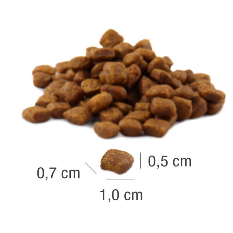 Složení: Čerstvé kuřecí maso 83 %, Flor de Maíz (nejkvalitnější kukuřičná mouka), čerstvý losos, směs brambor*, hrášku* a rýže, pivovarské kvasnice*, vláknina zeleniny*, vejce*, sůl, lososový olej, kořen čekanky* (FOS). (*sušené)