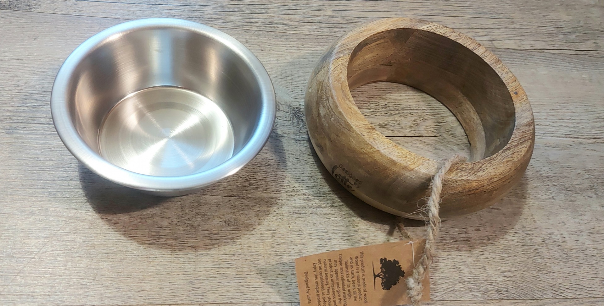 Hypoalergenní přírodní materiály dřevo / nerez nezpůsobují kožní potíže ani alergie při kontaktu s miskou