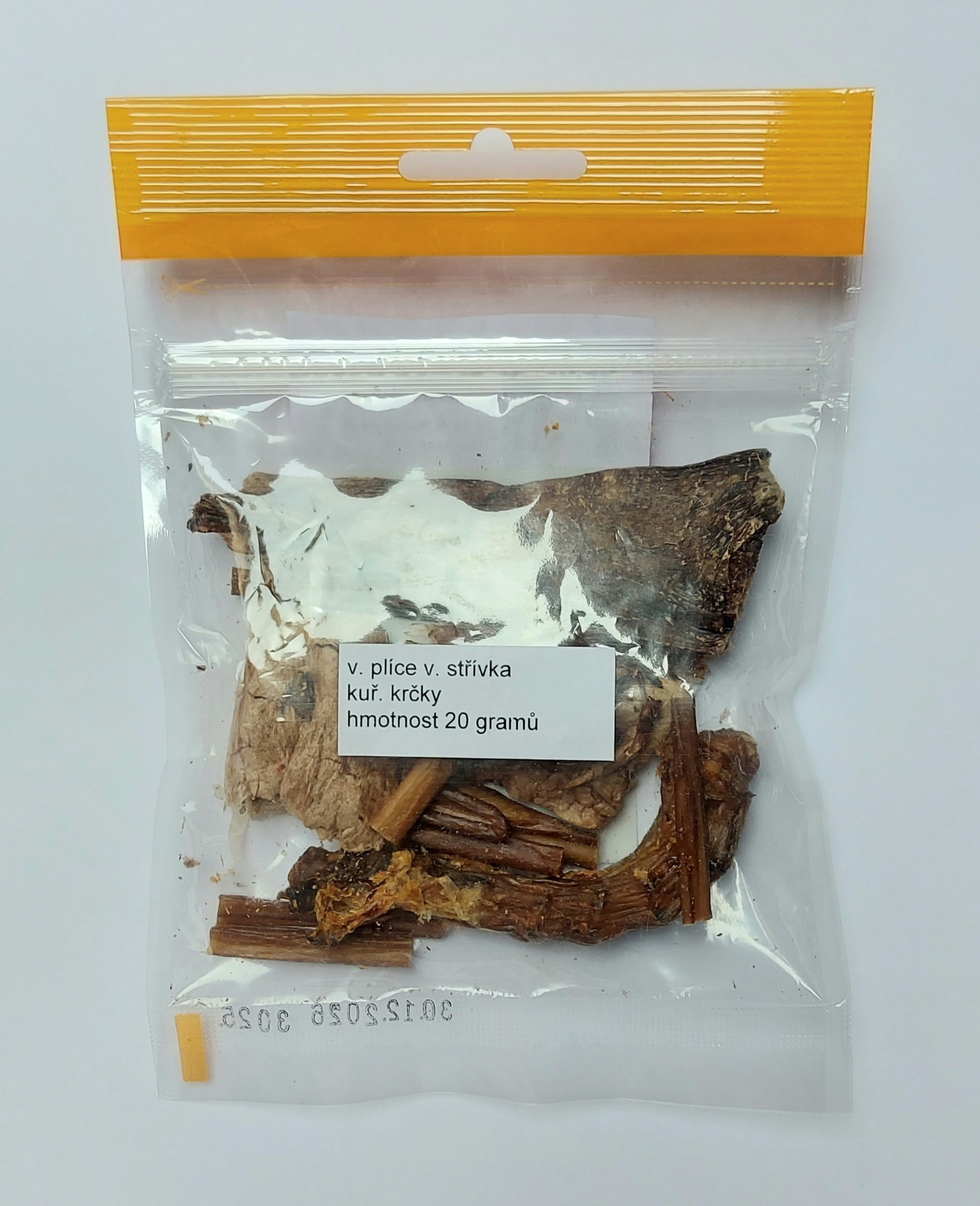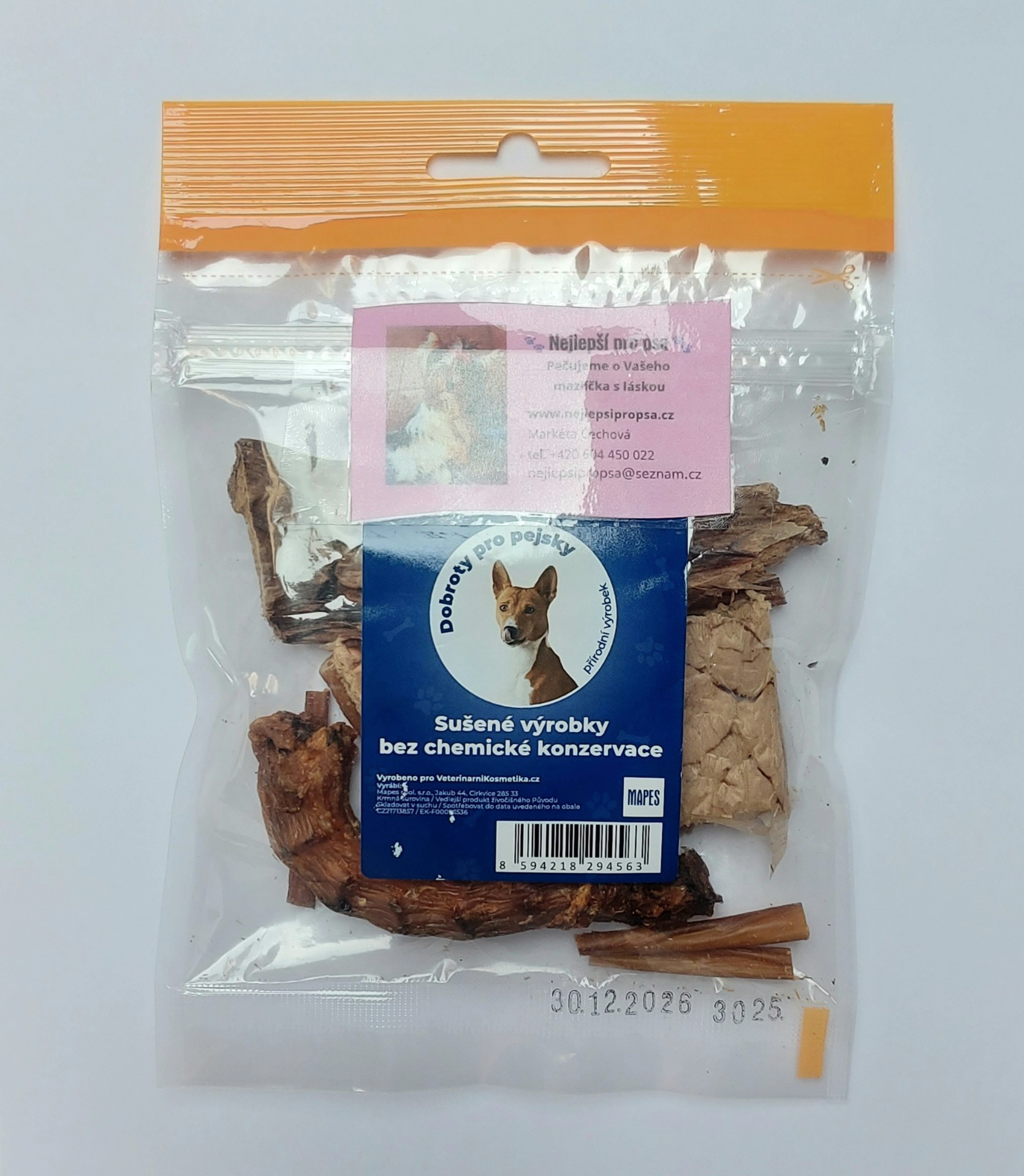 Obsahem jsou sušená střívka, vnitřnosti a jiné žvýkací pamlsky pro psy malých a středních plemen