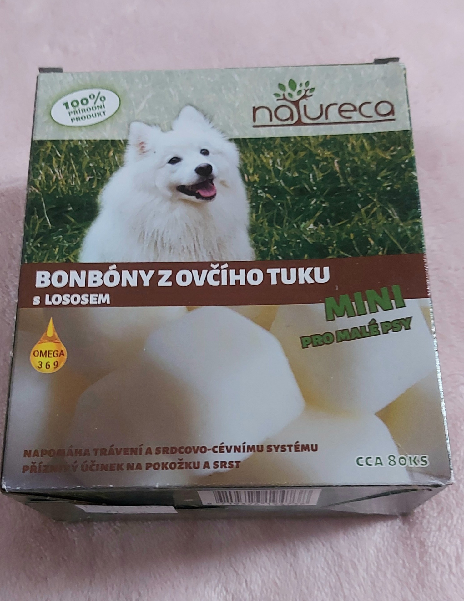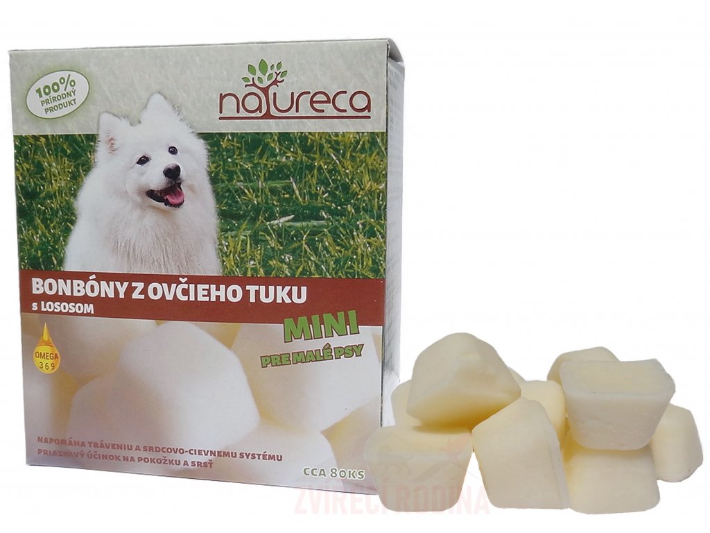 Originální bonbóny z ovčího tuku s lososovým olejem /doplňkové krmivo/ NATURECA jsou přírodním produktem podporujícím odolnost organismu, kvalitu pokožky a srsti, napomáhají trávení a příznivě působí na činnost srdce a kardiovaskulárního systému