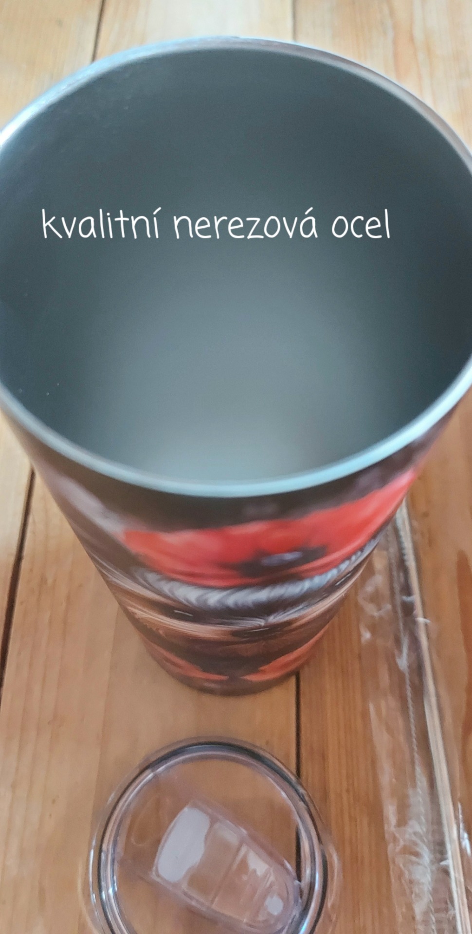 Součástí je také nerezové brčko, kterým lze pít nápoje z termohrnku a průhledné víčko s uzavíratelným otvorem na pití