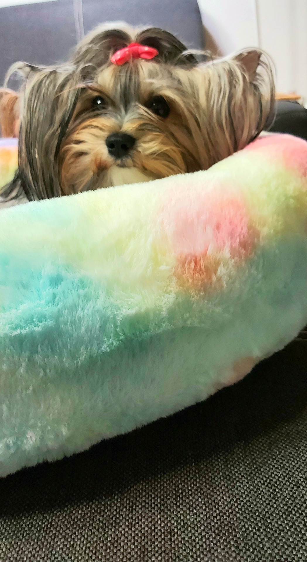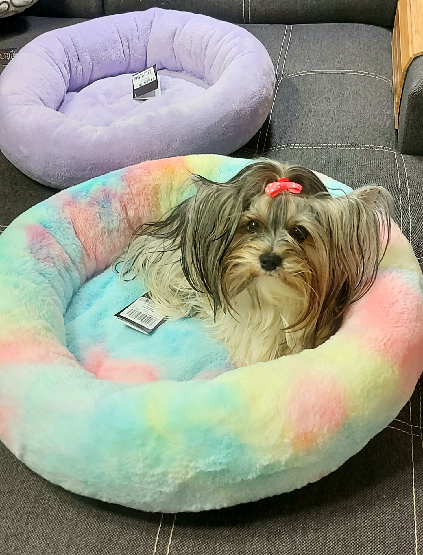 Pelíšek je úžasně nadýchaný a hřejivý. Má kruhový tvar s vyvýšeným komfortně polstrovaným okrajem
