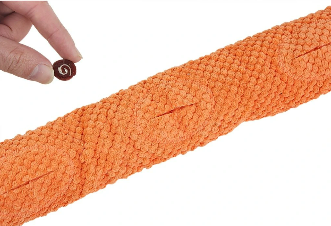Hračka má otvory pro naplnění oblíbenými pamlsky a suché zipy pro možnost srolování hračky