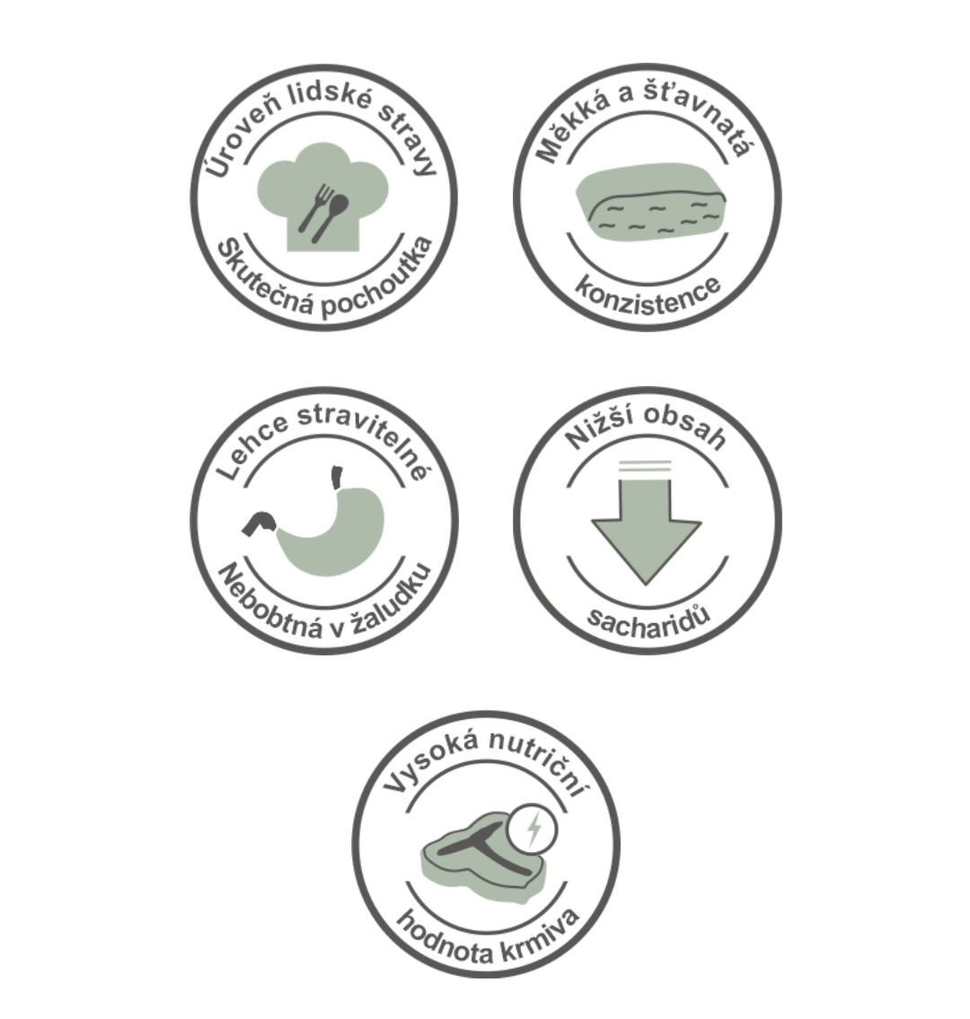 - Výhoda měkkých šťavnatých granulí ocení majitelé starších pejsků, kteří mají problémy s kousáním tvrdých granulí