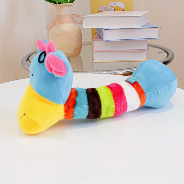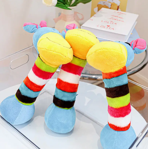 Při přetahování můžete pískátko zmáčknout na jednom konci žirafy a pejsek kousáním může aktivovat pískátko na druhém konci žirafy - zábava a přetahování může začít!