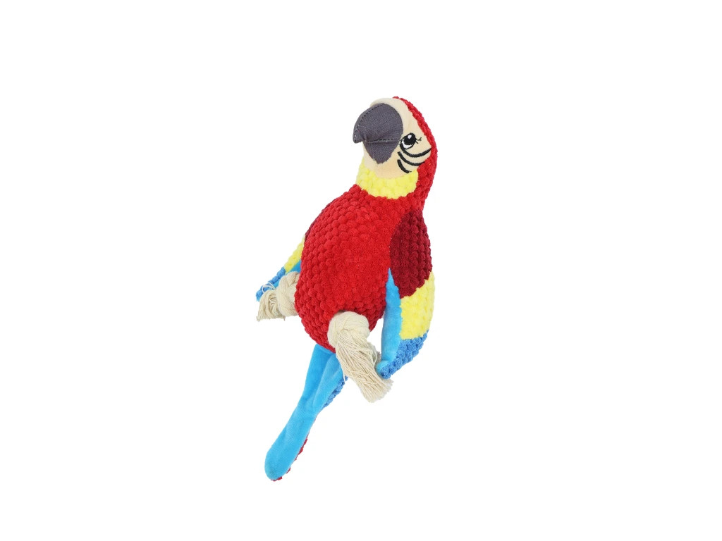 Roztomilý pískací a šustící plyšový papoušek s bavlněným lanem potěší každého mazlíčka
