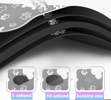 Podložka okamžitě absorbuje vylité tekutiny a je rychleschnoucí, tudíž nemusíte mít obavy o okolí misek Vašeho mazlíčka