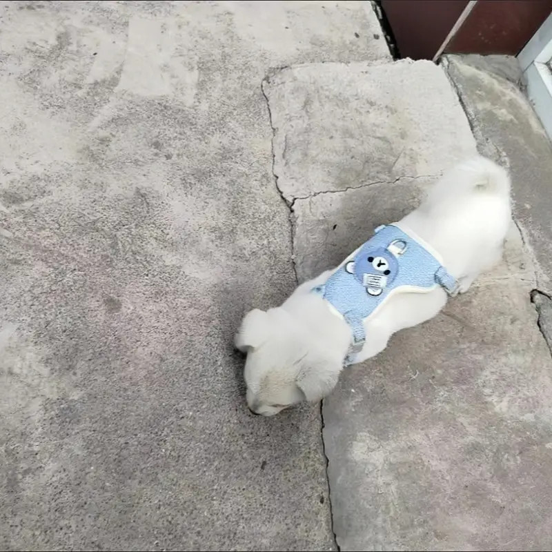 Doporučuji přes oblečení dávat postroj, oblečení tak lépe drží na bříšku a chrání před větrem a chladem, pejskovi je teplo