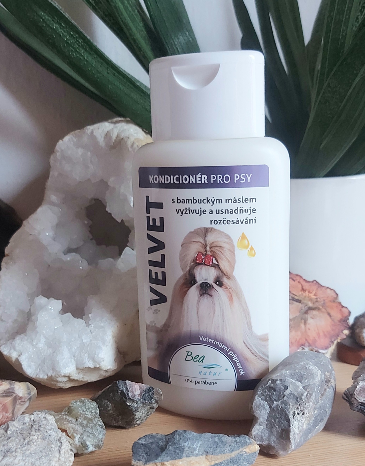 Přírodní oplachový kondicionér 2v1 rozčesávač velmi zacuchané srsti Velvet pro psy a štěňata
